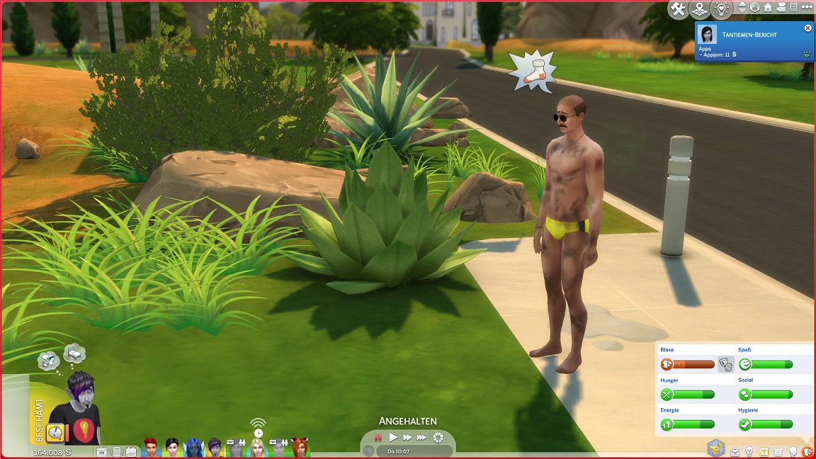 Er bemüht sich, aber sein Witz rächt sich: Es gibt keine Toilette, er kann auch keine erwerben, und die Blase drückt.
