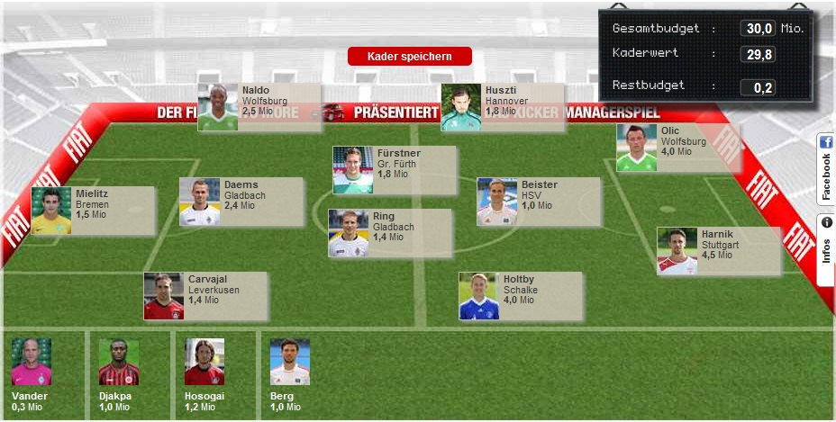 Im Mittelfeld hab ich ne Weile zwischen zig verschiedenen varianten hin- und herprobiert, hatte anfangs sogar Kuzmanovic und Kvist drin, weil ich Stuttgart durchaus was zutraue (später dann Hajnal, aber der flog auch wieder). Aber die waren dann doch etwas teuer und überhaupt... irgendne Wahl musste ich ja treffen. Da ich in den diversen Threads zu den Managerspielen hier fleißig mitgelesen hab, war ich eh nicht mehr ganz unbeeinflusst. :D