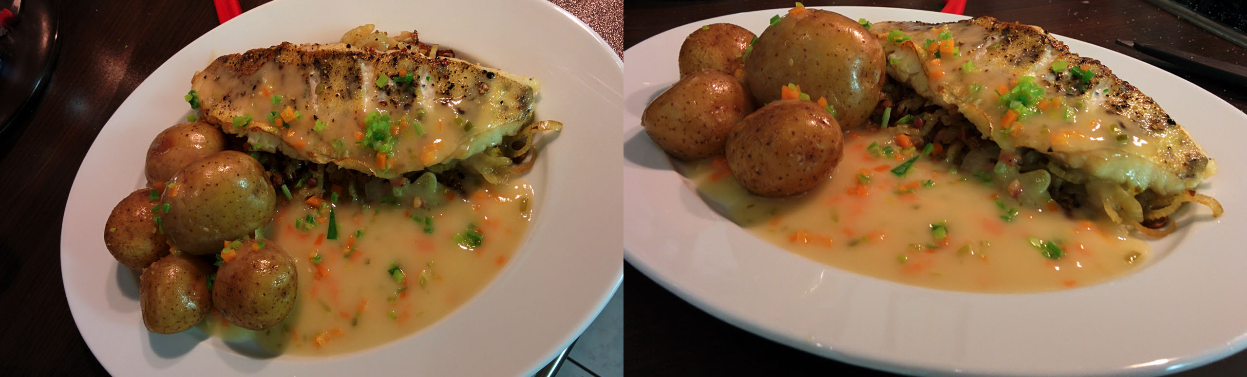 Wir hatten heute Regenbogenforelle Müllerin Art mit Kartoffelbrei und Soße. :lecker