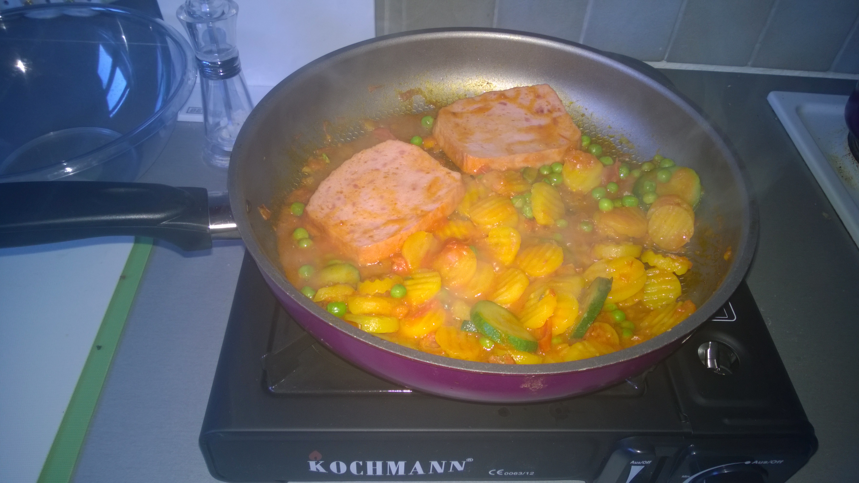 Nö: "Unter ständigem Umrühren langsam erhitzen" Gesagt, getan! Auch das Endprodukt, ein etwas weniger dickflüßiger gelbe Erbsen-Kartoffel eintopf mit Gemüse und Speck und Bockwurst sieht nicht so super toll aus.