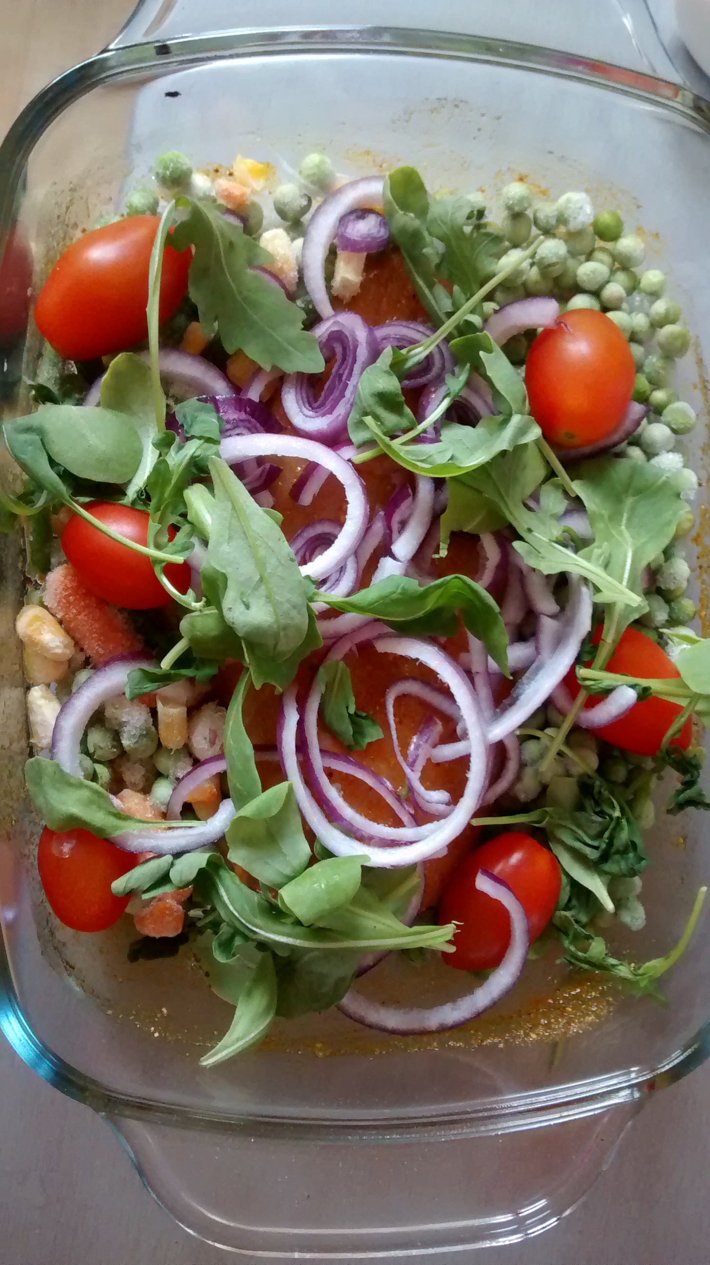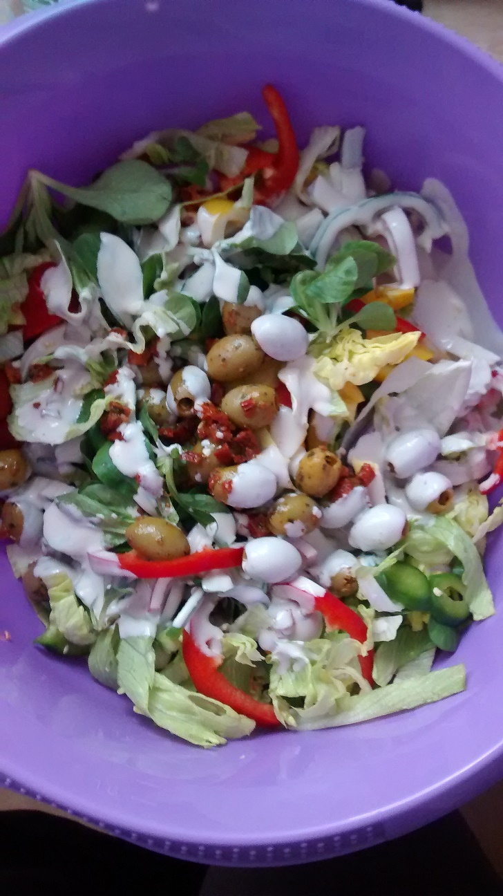 Wir haben Heute mal Tabouleh ausprobiert, einen Salat aus Bulgur (haben allerdings Ebly genommen), Tomaten, Gurke und Glattpetersilie. Noch Schafskäse dazu, gute Sache bei dem heissen Wetter.
