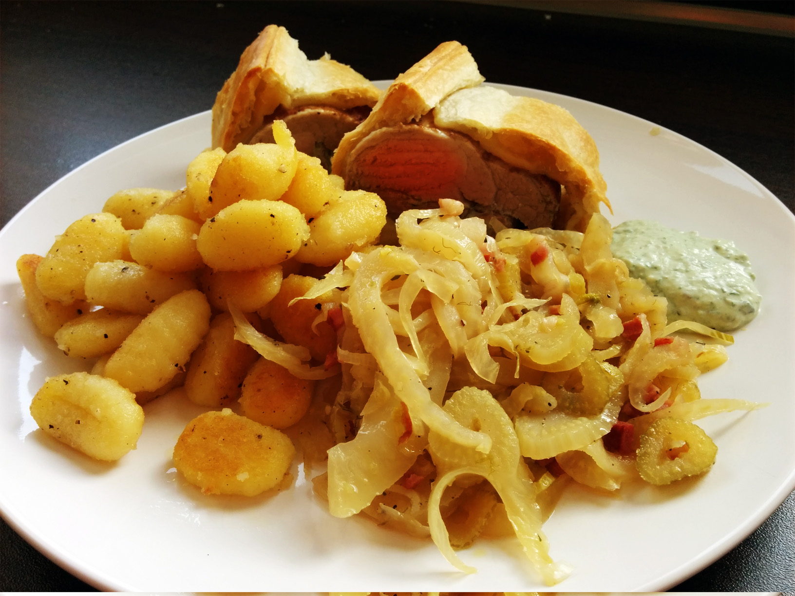 Falls man es nicht erkennen kann^^ Es handelt sich hierbei um Schweinefilet gefüllt mit einer Schafskäse-Ruccola-Kräuter Füllung an Fenchelgemüse und gebratenen Gnocchi.