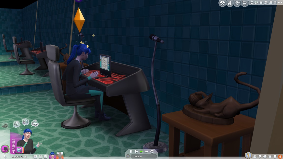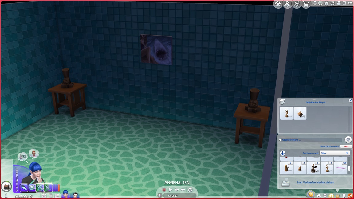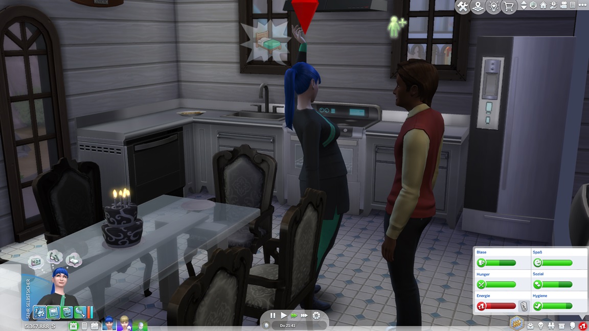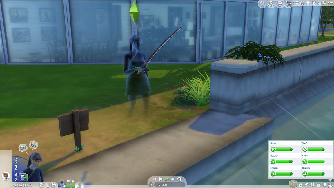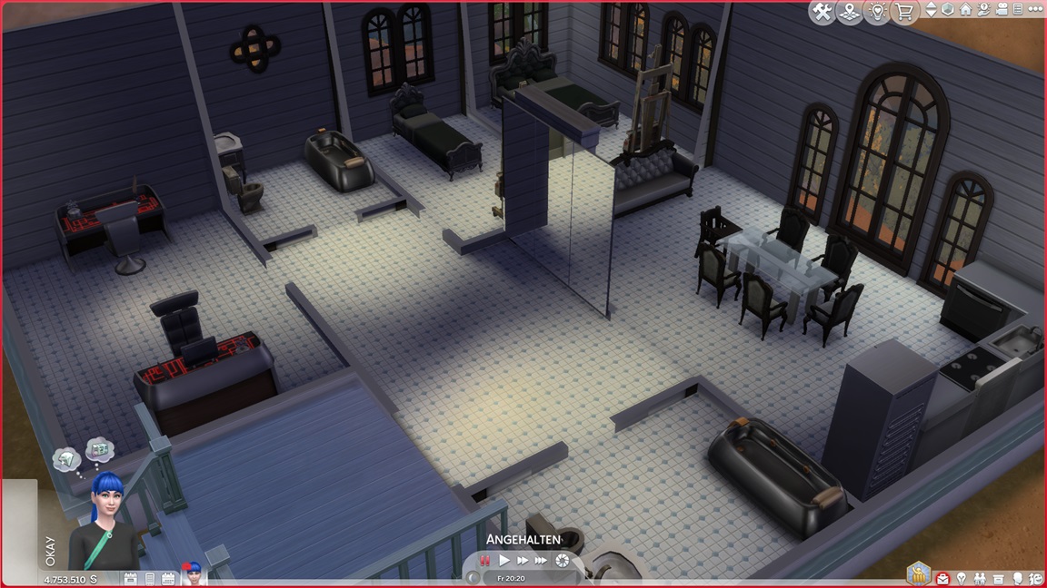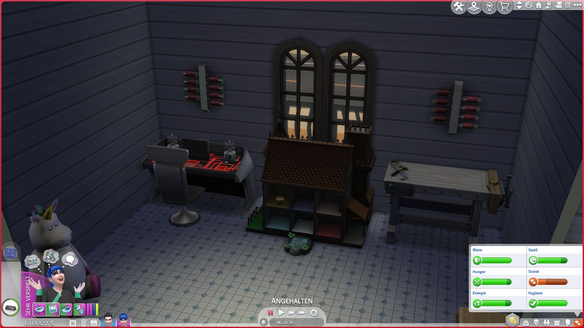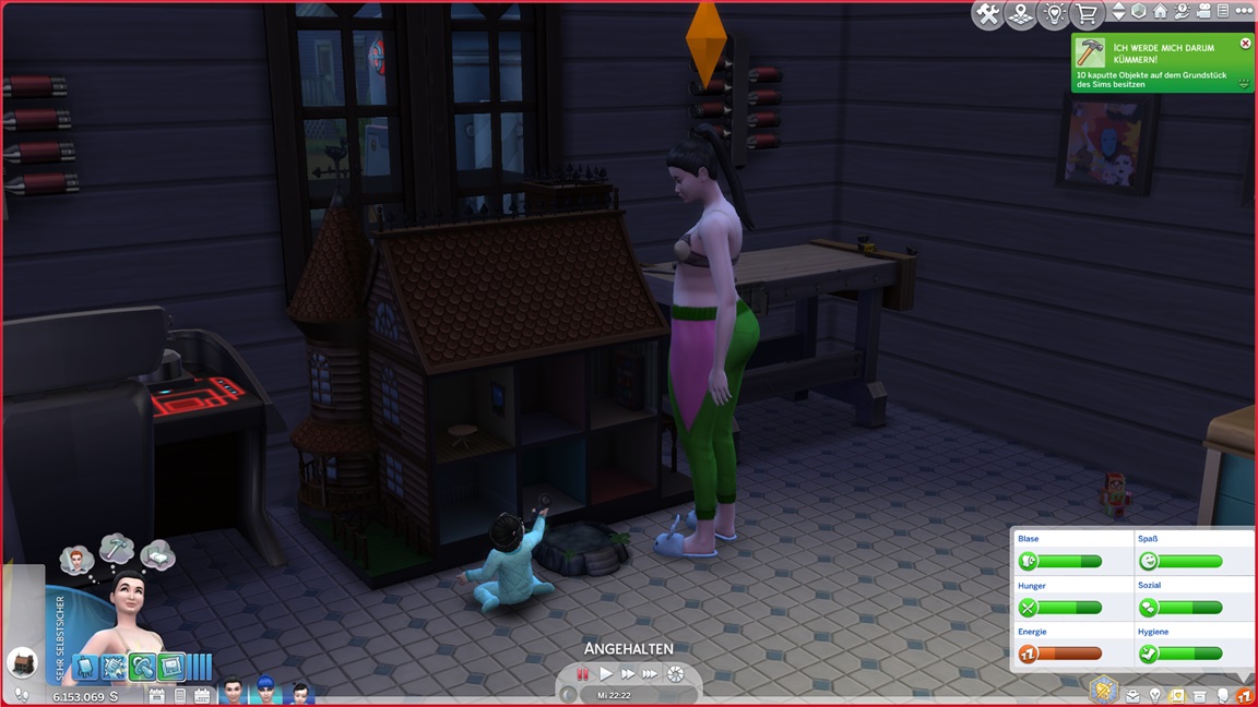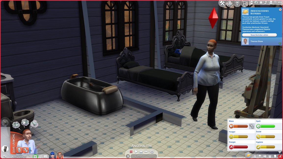 Dies könnte die Grundlage einer weiteren Episode darstellen, da ich dafür sonst ungenutzte Stimmungsräume einrichten würde (für Wut und Trauer). Sie könnte allerdings recht kurz ausfallen. Ich müsste auf einen relativ frischen Charakter zurückgreifen, da ich oft Scham und Stress mittels Belohnungen wegkaufe, und da ich den Sim auch in allerlei negative Stimmungen versetzen müsste, könnte sie recht düster ausfallen.