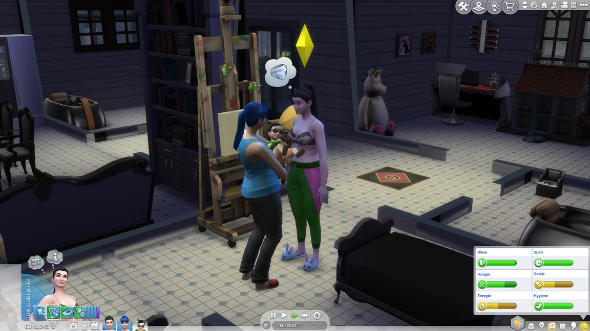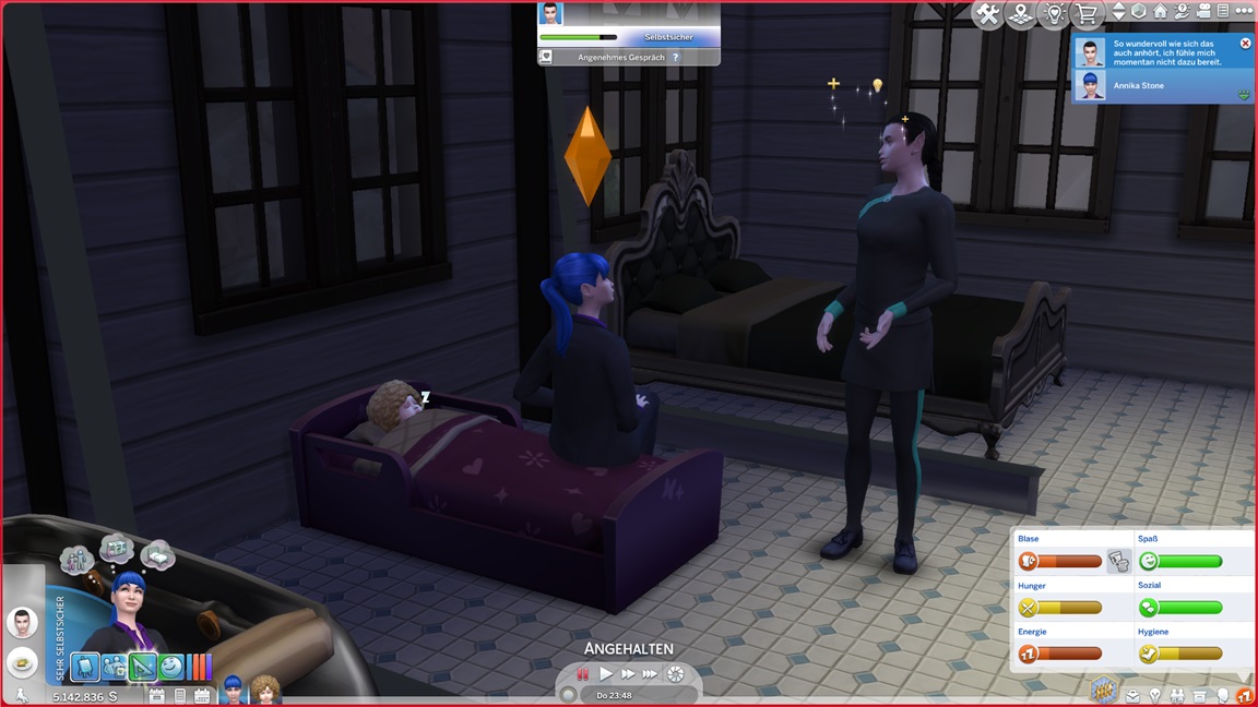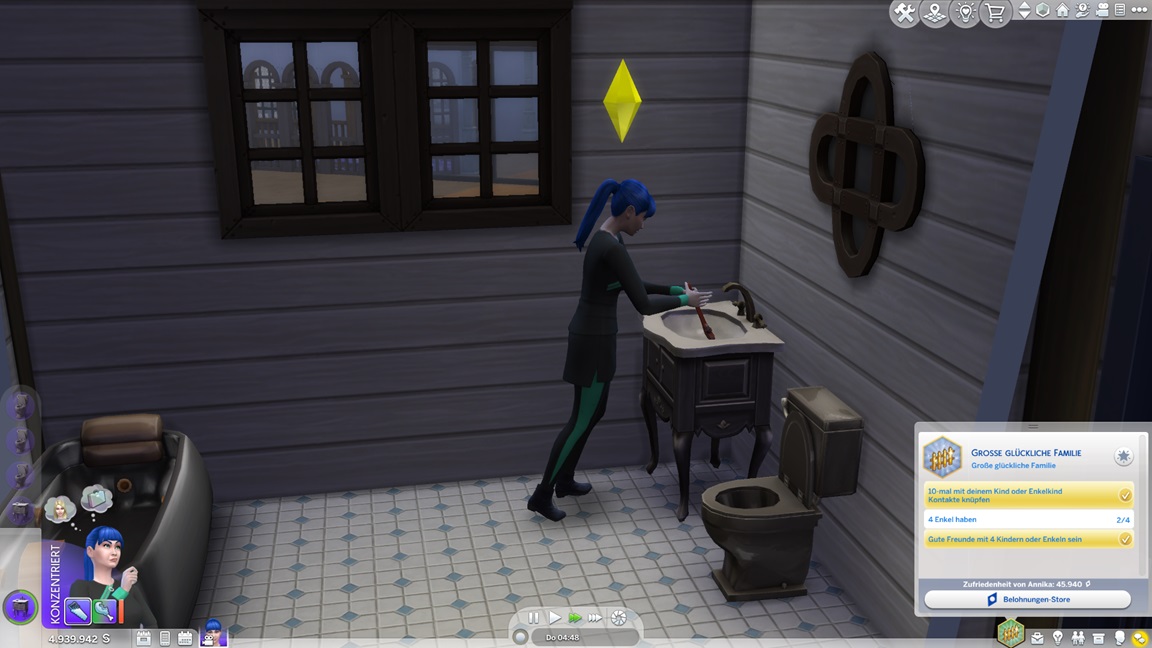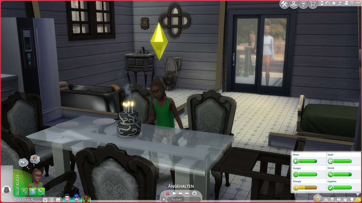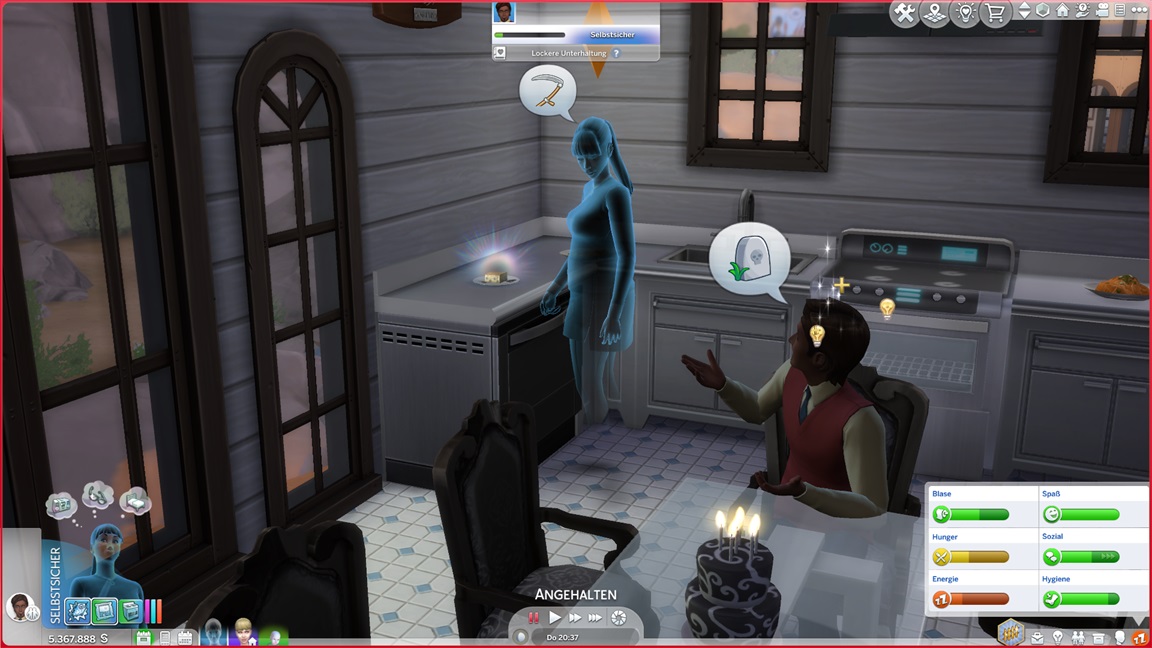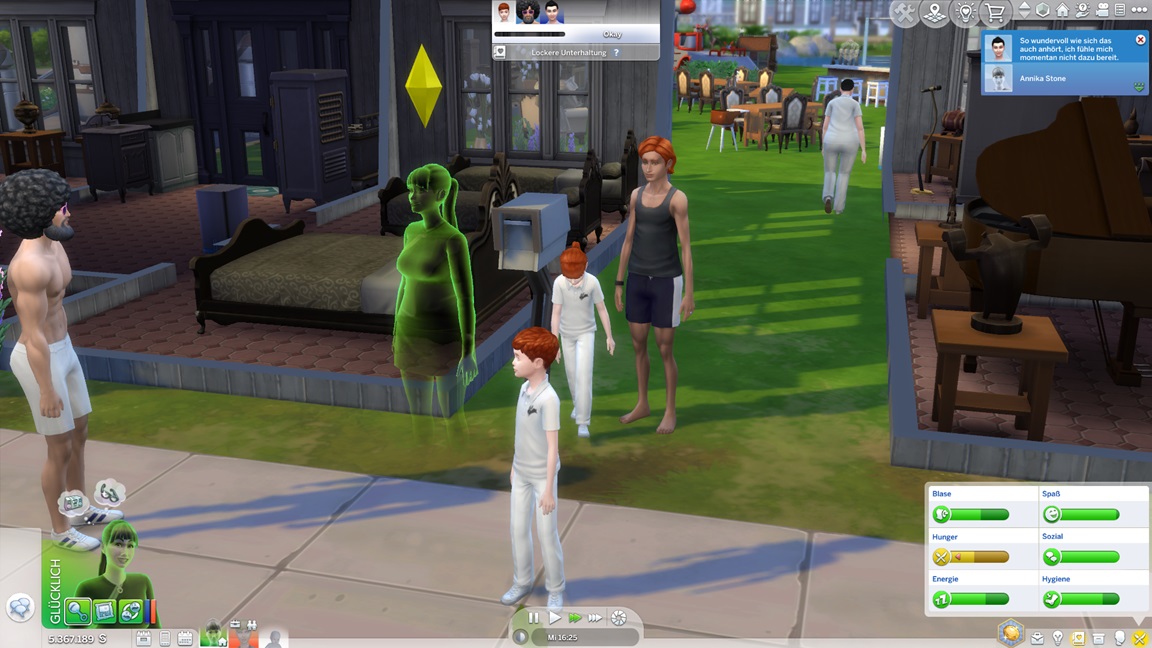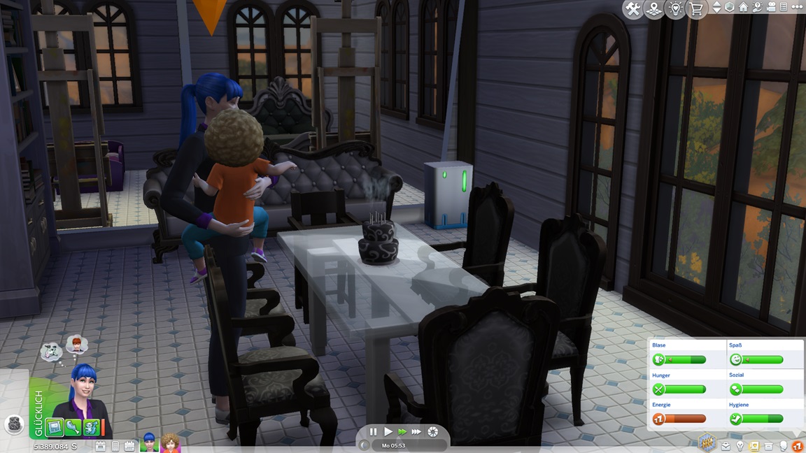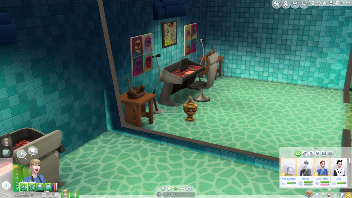 Dies könnte die Grundlage einer weiteren Episode darstellen, da ich dafür sonst ungenutzte Stimmungsräume einrichten würde (für Wut und Trauer). Sie könnte allerdings recht kurz ausfallen. Ich müsste auf einen relativ frischen Charakter zurückgreifen, da ich oft Scham und Stress mittels Belohnungen wegkaufe, und da ich den Sim auch in allerlei negative Stimmungen versetzen müsste, könnte sie recht düster ausfallen.
