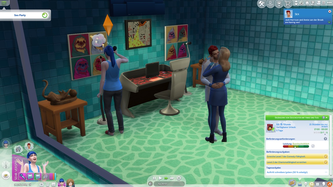 ... und beginnt damit, einen Comedy-Raum einzurichten. Renata maximiert ihre Heimwerken-Fähigkeit und rotiert zugunsten ihrer Kollegin Celia heraus, die dieses Maximum allerdings bereits aufweist. So folgt Annika dem Wink des Spiels.