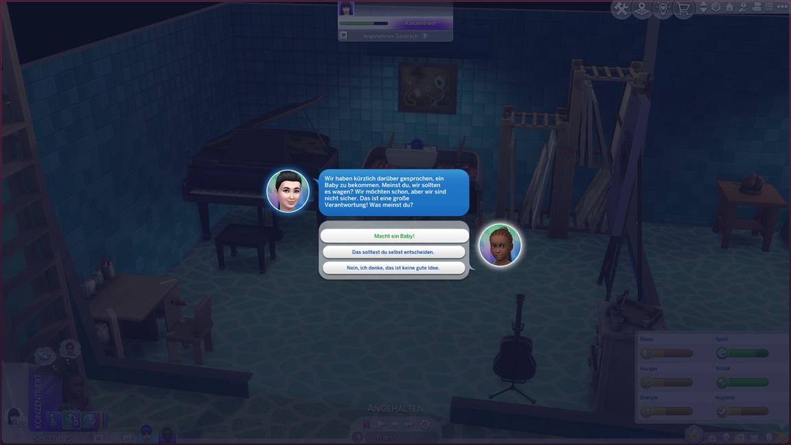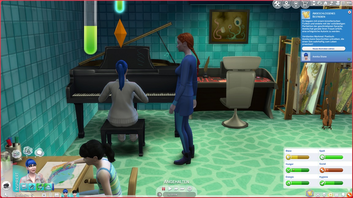 Annika stellt fest, dass sie Klavier mag. Ihr fehlen nun noch die beiden Romantikbestrebungen. Pia jubelt und fährt mit Sozial fort.