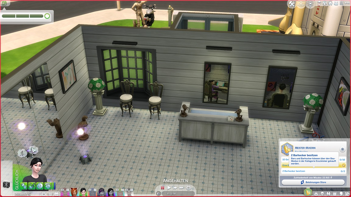 Mizuko platziert für ihr Bestreben zwei Barhocker (am Rand, da sie den freien Platz vor der Theke erhalten möchte).
