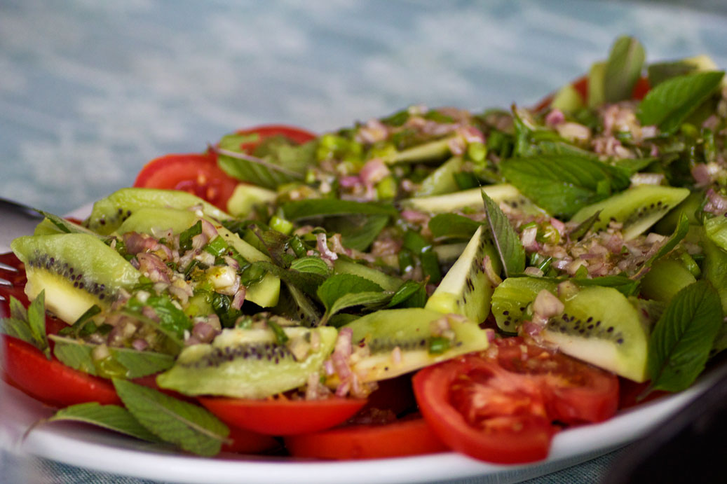 Weiterhin einen eigenartig anmutenden aber echt guten Salat aus Tomaten, Kiwis und Minze. Das Dressing wird aus Limettensaft, Limettenschale, Knoblauch, Peperoni, Lauchzwiebeln, braunem Zucker, Salz und Pfeffer zusammengerührt. Kann ich empfehlen.