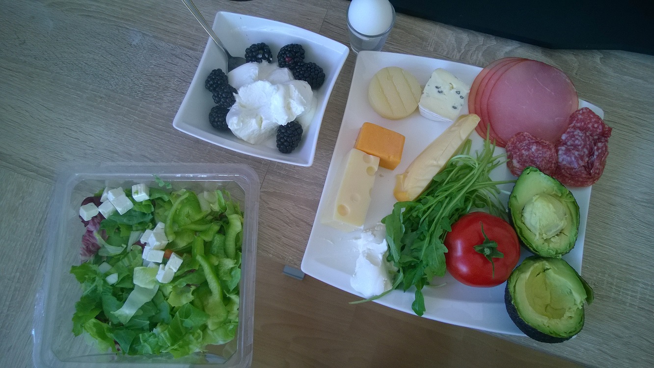Ich begeistere mich gerade für vegetarisches Essen. Links unten Bratpaprika, dann Salat aus Avocado, Radieschen, Mozarella, Parmesan, Johannisbeeren und roten Zwiebeln. Das drüber ist Orangensalat mit Schalottenzwiebeln. Da gehören eigentlich noch schwarze Oliven drauf, aber die mag eins meiner Kinder nicht. Ganz oben dann Feta mit Tomaten und Knoblauch gebacken, auch olivenfrei, deshalb stehen sie daneben. Das Brot ist auch selbst gebackt ( aber von meiner Mama :D )