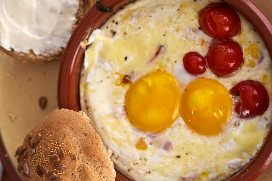 Pro Person ein Förmchen buttern. Eine Handvoll kleine Tomaten mit Olivenöl, gehackten Zwiebeln, Knoblauch, gehacktem Basilikum kurz in der Pfanne anbraten. Wenn gewünscht Schinkenstreifen auf dem Boden der Form verteilen, dann die Tomaten drauf geben. Bei mir kamen dann etwas Ziegenfrischkäse und zwei oder drei Esslöffel geriebener Gouda. Zwei Eier in Eigelb und Eiweiß trennen. Das Eiweiß mit einem Schuß Sahne oder Sauerrahm oder Creme Fraiche gut vermischen ( ich hab einen Schüttelbecher genommen ). Über den Rest der Zutaten kippen und die Eigelbe vorsichtig oben drauf setzen. Dann bei 200 ° Grad für ca. 12-13 Minuten backen. Etwas Salz und frisch gemahlenen Pfeffer drüber und fertig.