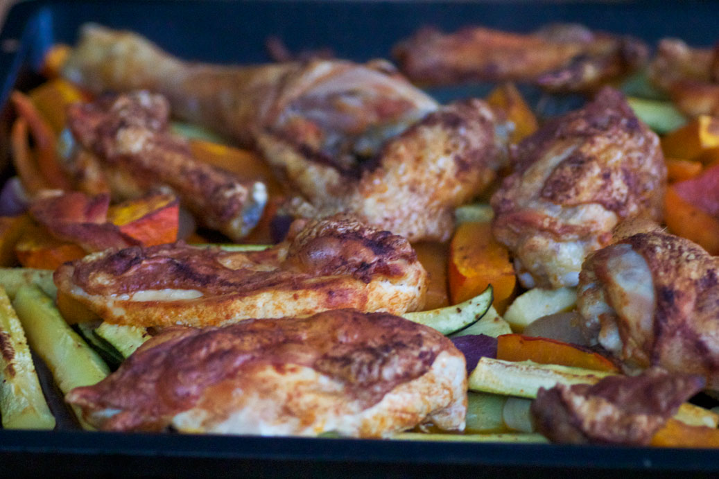 Gemüse ( Hokkaido Kürbis, Karotten, rote Zwiebeln, kleine weiße Zwiebeln, Zucchini ) mit Salz, Pfeffer und Olivenöl einpinseln/bestreuen. Dann Hühnchenteile (es war ein dickes, französisches Biohuhn ) drauf setzen. Das habe ich vorher mit geräuchertem, scharfem Paprika und Olivenöl eingepinselt. Auf 200 ° Grad für ca 40 Minuten in den Backofen schieben und dann aufessen.