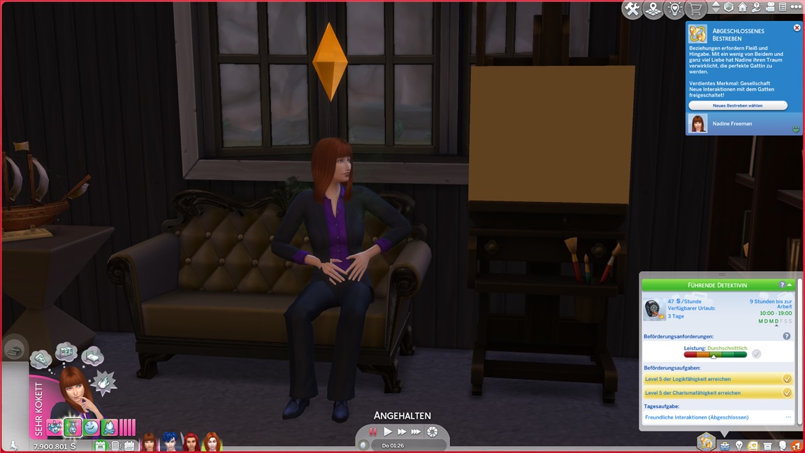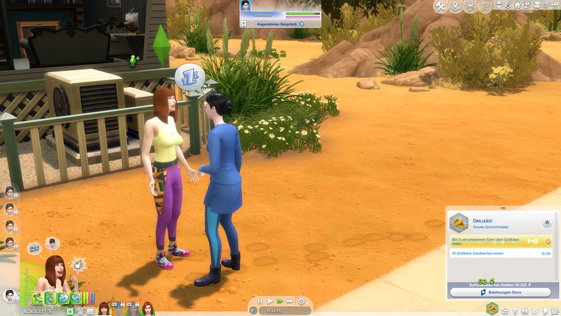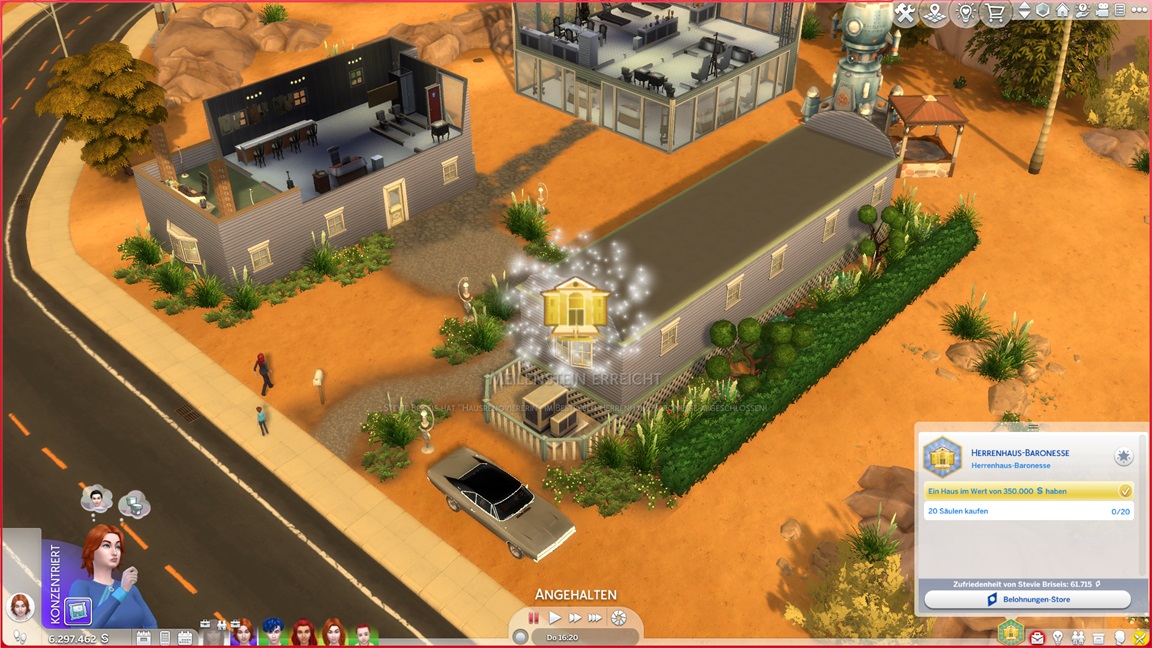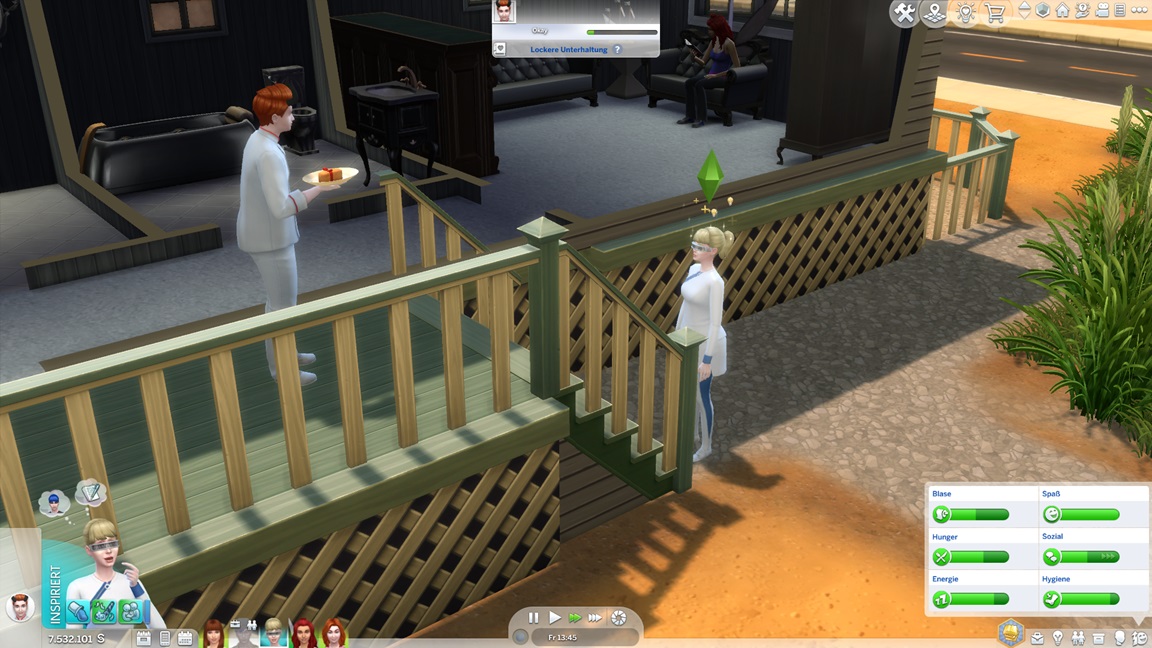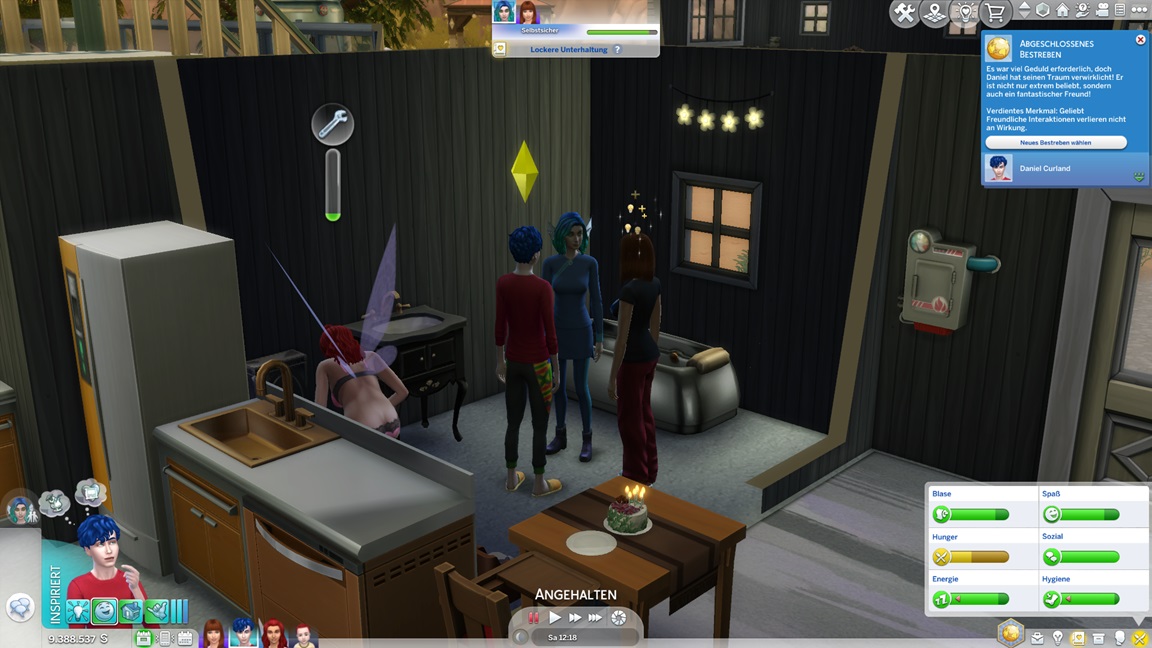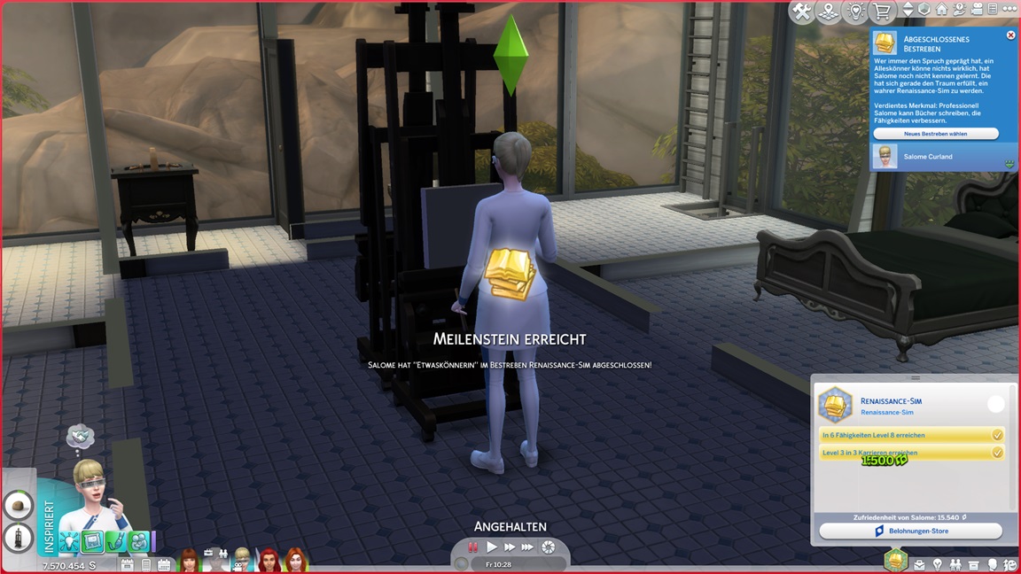 Bei der "Challenge" geht es allein darum, das Spiel täglich zu starten, um sich (der Reihe nach) einen Gegenstand abzuholen. Bei der vorletzten handelt es sich um die Eigenart "Übung macht den Meister", die einige der Sims kurioserweise bereits per Zufallswahl erhalten konnten. Sie wirkt auf mich eher blass. (Ein Sim mit dieser Eigenart lernt zunächst langsamer, bei höheren Fertigkeitswerten aber schneller.)