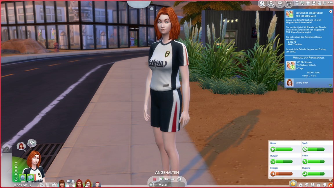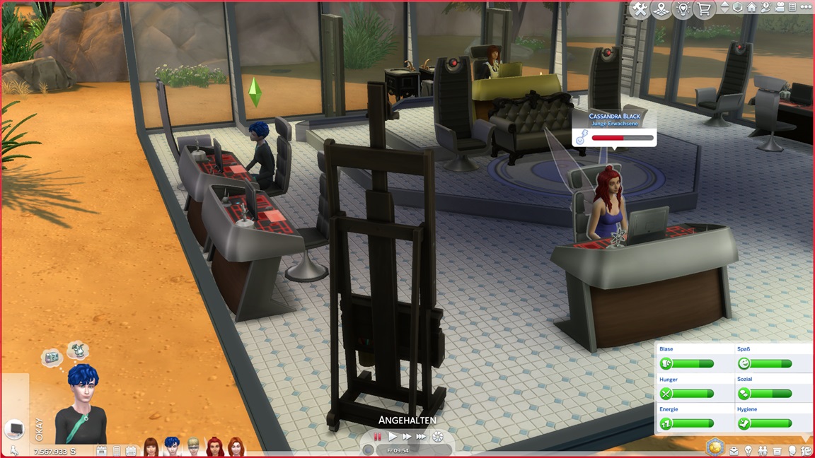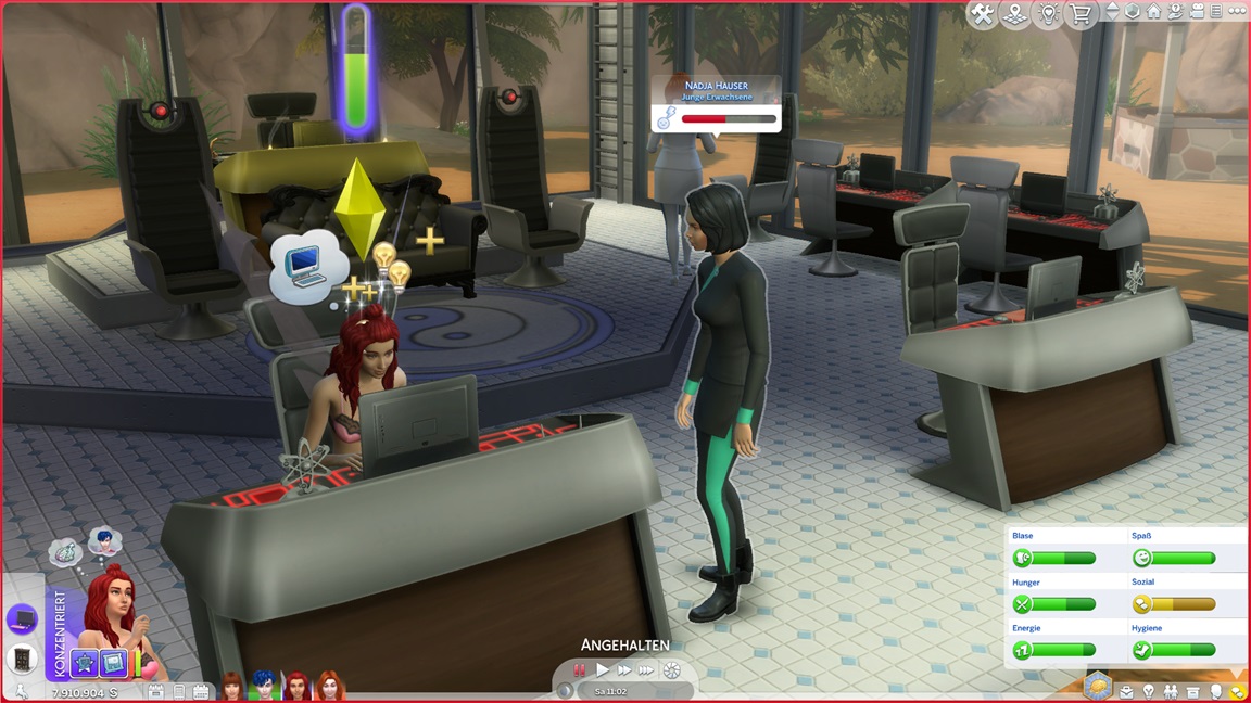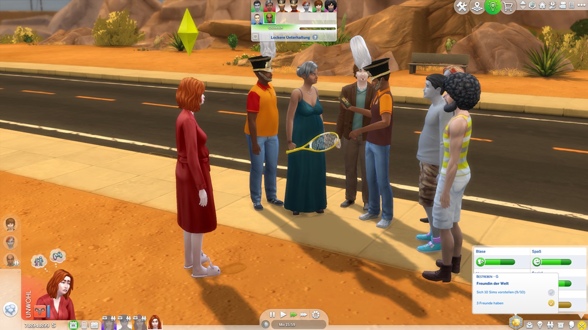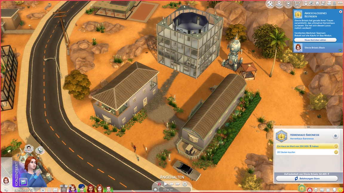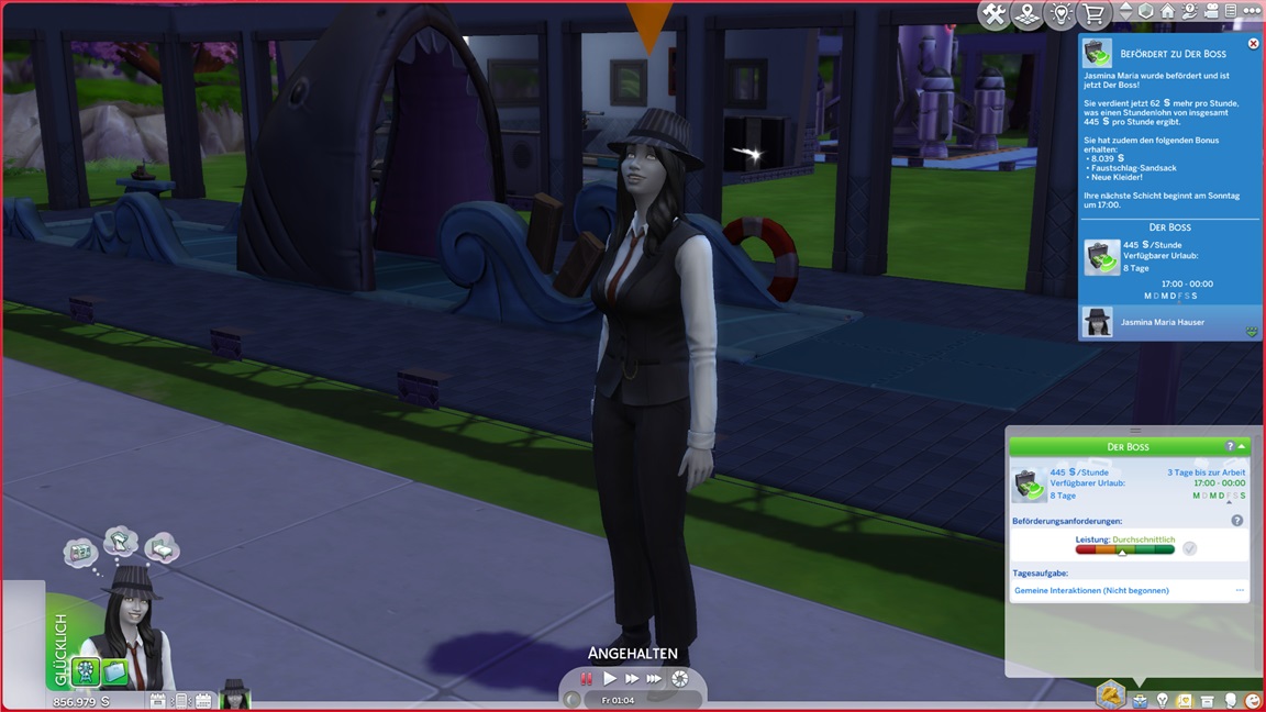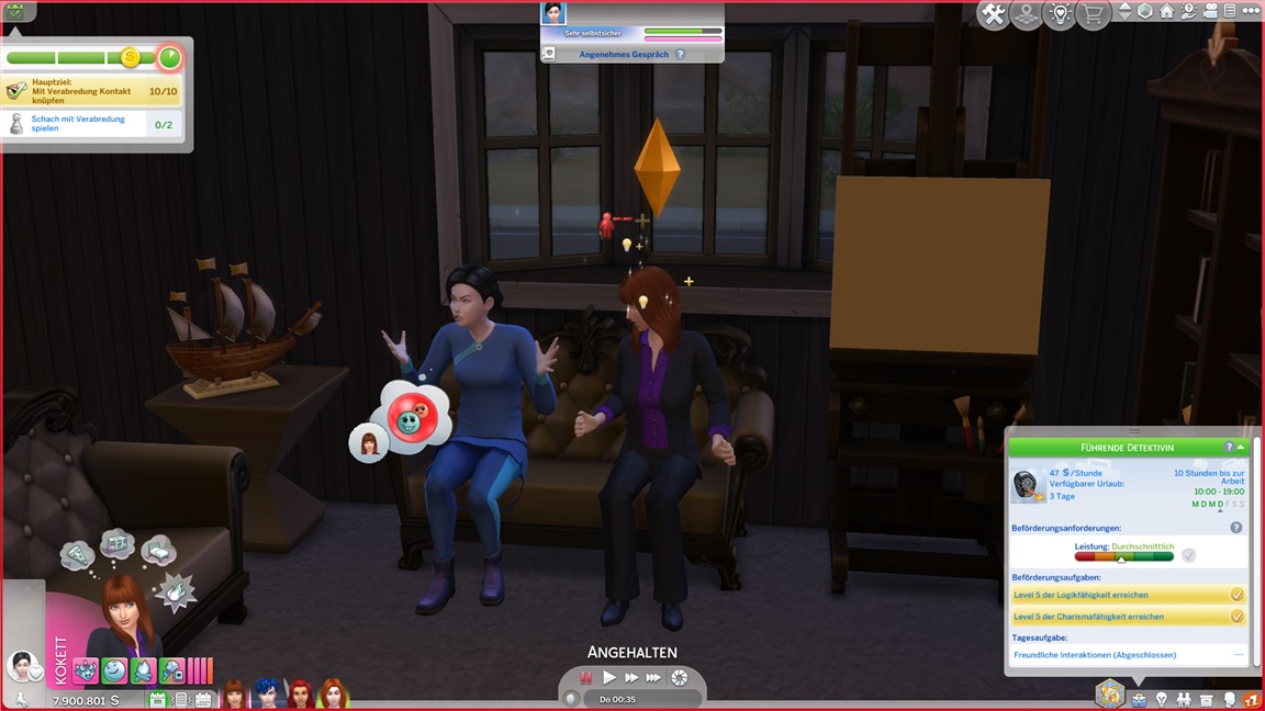 Bei der "Challenge" geht es allein darum, das Spiel täglich zu starten, um sich (der Reihe nach) einen Gegenstand abzuholen. Bei der vorletzten handelt es sich um die Eigenart "Übung macht den Meister", die einige der Sims kurioserweise bereits per Zufallswahl erhalten konnten. Sie wirkt auf mich eher blass. (Ein Sim mit dieser Eigenart lernt zunächst langsamer, bei höheren Fertigkeitswerten aber schneller.)