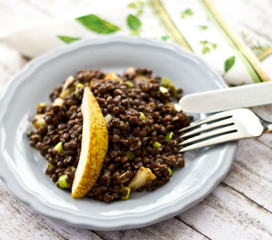 Linsensalat mit Frühlingszwiebel und Birne