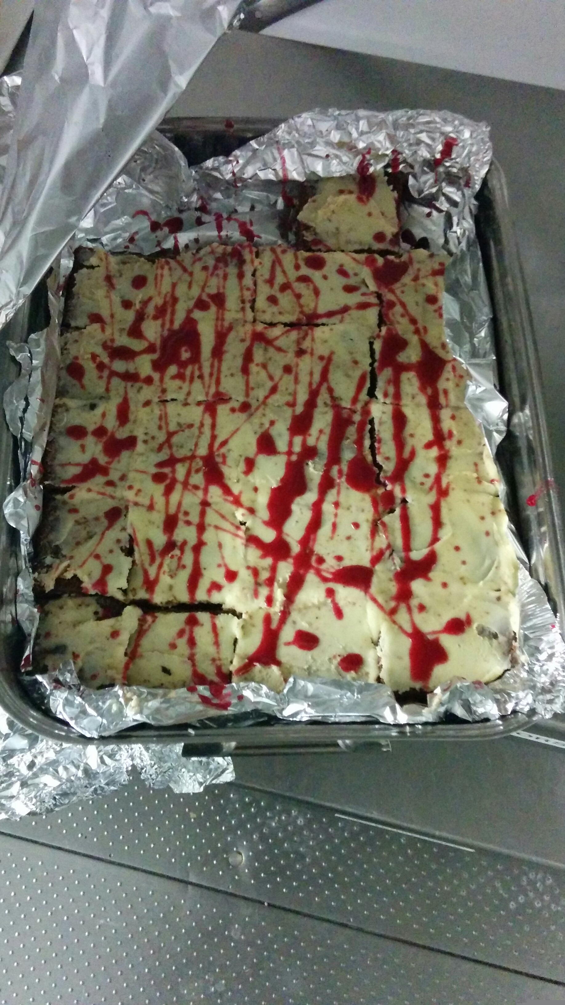 Hmm meine brownies sind leider nicht so fluffig wie erhofft aber immernoch in ordnung :( naja nach der schicht weisser schokolade als topping kokmen noch ein paar blutspritzer aus kirschreduktion drauf :D bilder gibts morgen da ich nu keine zeit habe hier ein schlönes fertiges hochzuladen. Dazu wirds auch nen halloweenkostüm foto geben :) man muss ja wissen wer es serviert hat^^