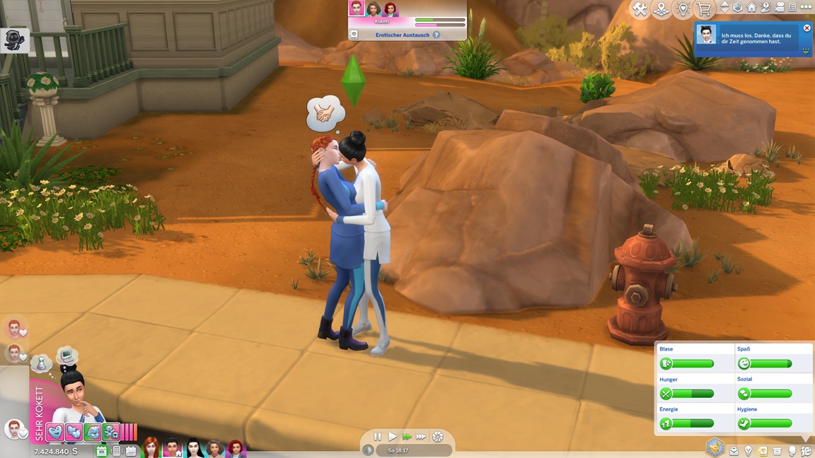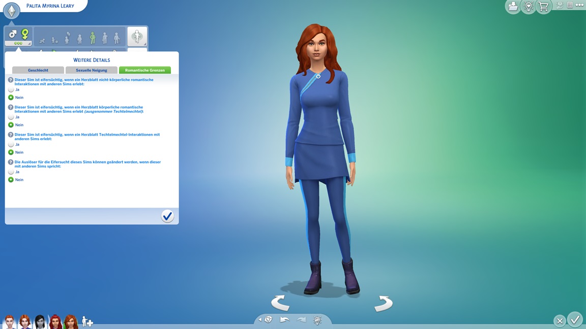 Da ich einen Moment Zeit hatte, ging ich durch die Mannschaftsliste der Axanar, um die romantischen Grenzen zu überprüfen - in den meisten Fällen vergeblich, da der Mod das an die Polyamorie anpasste. Bemerkenswert: Der Mod verbot bislang Mehrfachbeziehungen für eifersüchtige Sims, um diese Eigenart nicht zu entwerten. Die Designer des Spiels weisen keine solche Skrupel auf.