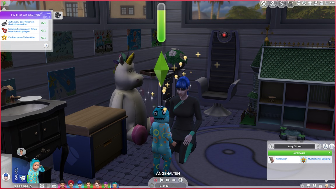Die erste endet damit bereits, für die andere muss man mit dem Sensenmann flirten. Annika kümmert sich um ihr Kind, das per Konsole die Eigenart nachgereicht bekam.