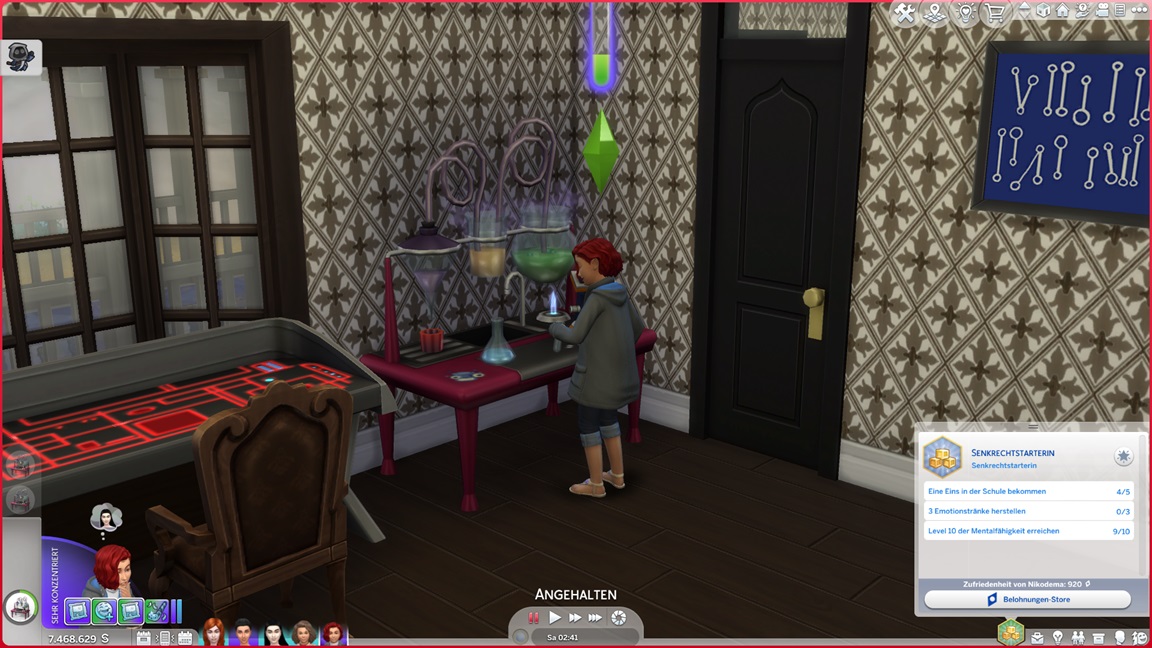 Sie wechselt auch zwischenzeitlich auf Mixerei, da sie diese Fähigkeit ohnehin pumpt. Gesammelte Kristalle füllen die Regale.