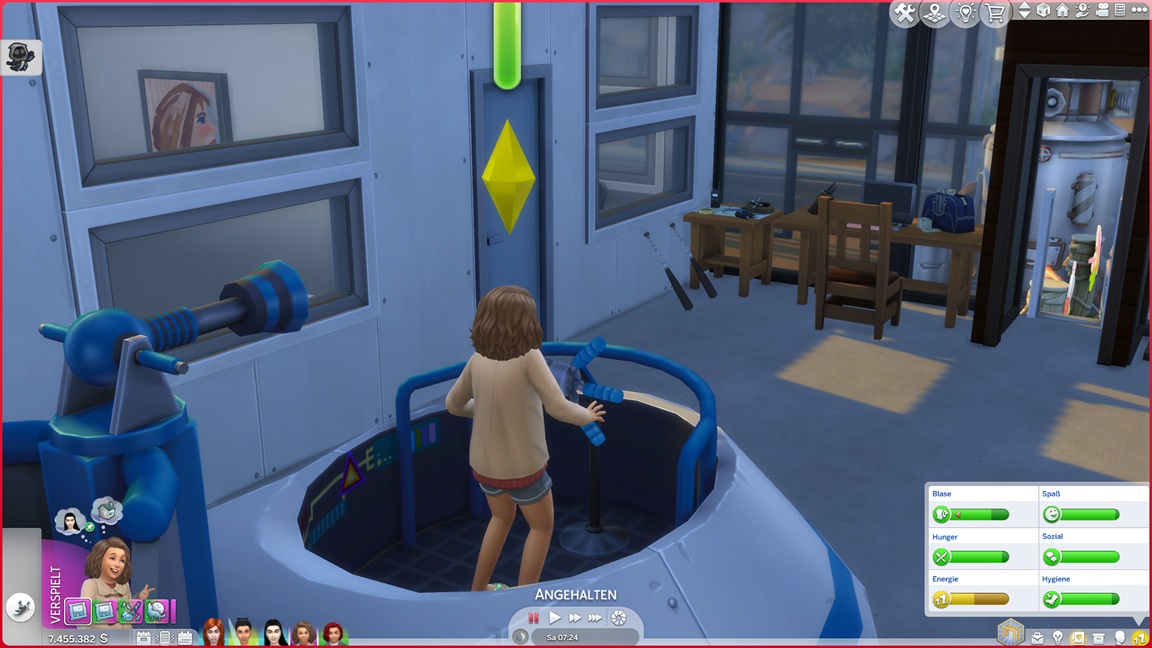 Das Setup der Axanar mit dem Kinderzimmer auf einem Stockwerk ohne Küche oder Badewanne ist... nicht optimal. Weil Kleinkinder keine Treppen nehmen können (oder Nikodema das noch nicht freischaltete), bedurfte es Transporte und Tricksereien. Ich ließ schon häufiger Essen über den Inventarweg im Kinderzimmer auftauchen, aber weil einfache Duschen nicht ausreichen, ließ sich der Trip trotzdem nicht umgehen.