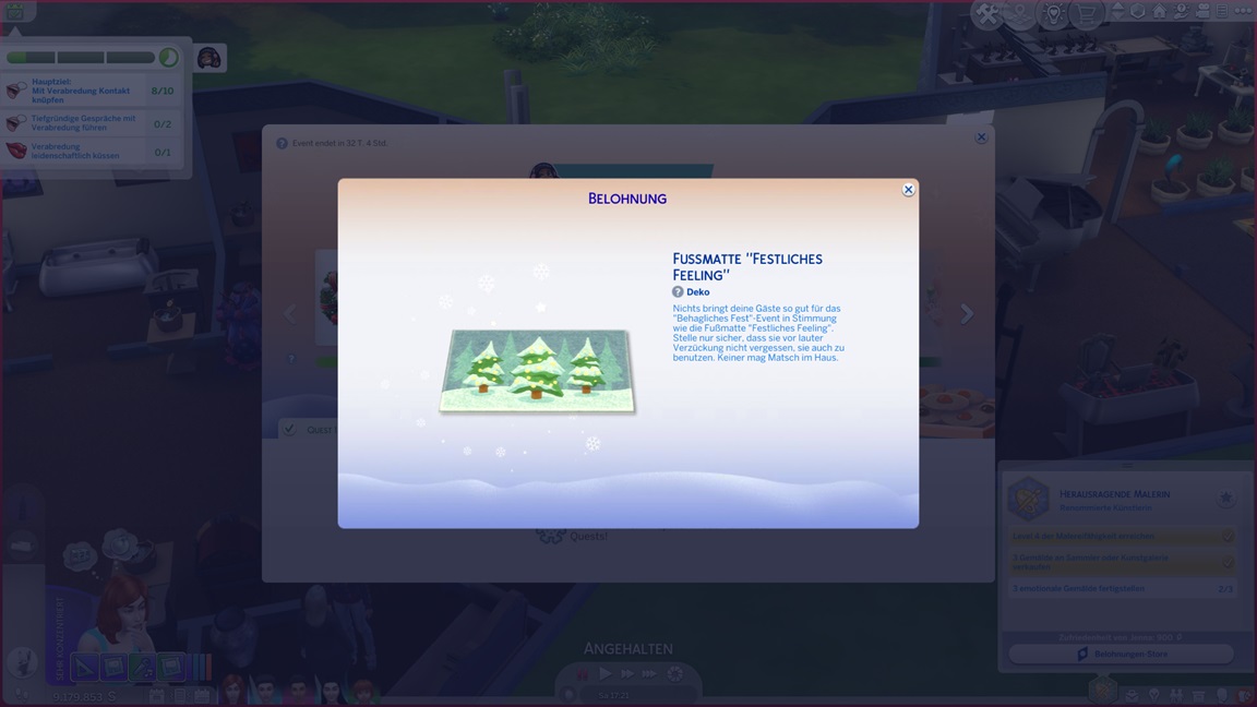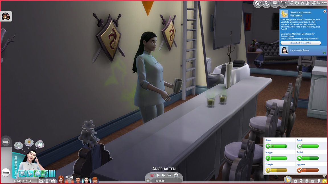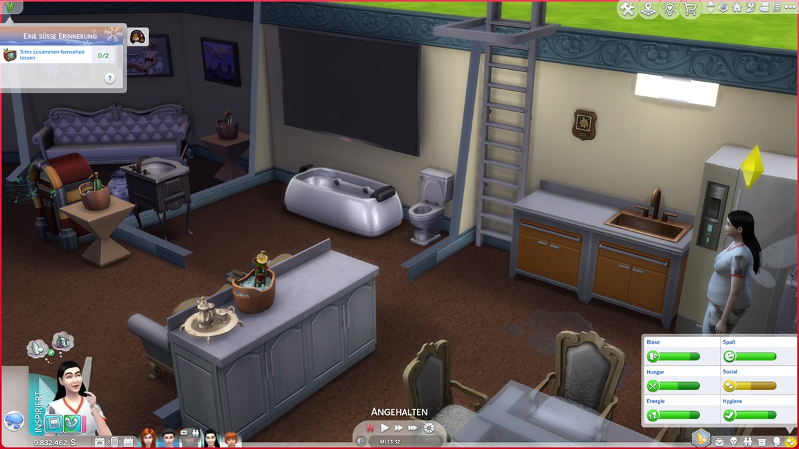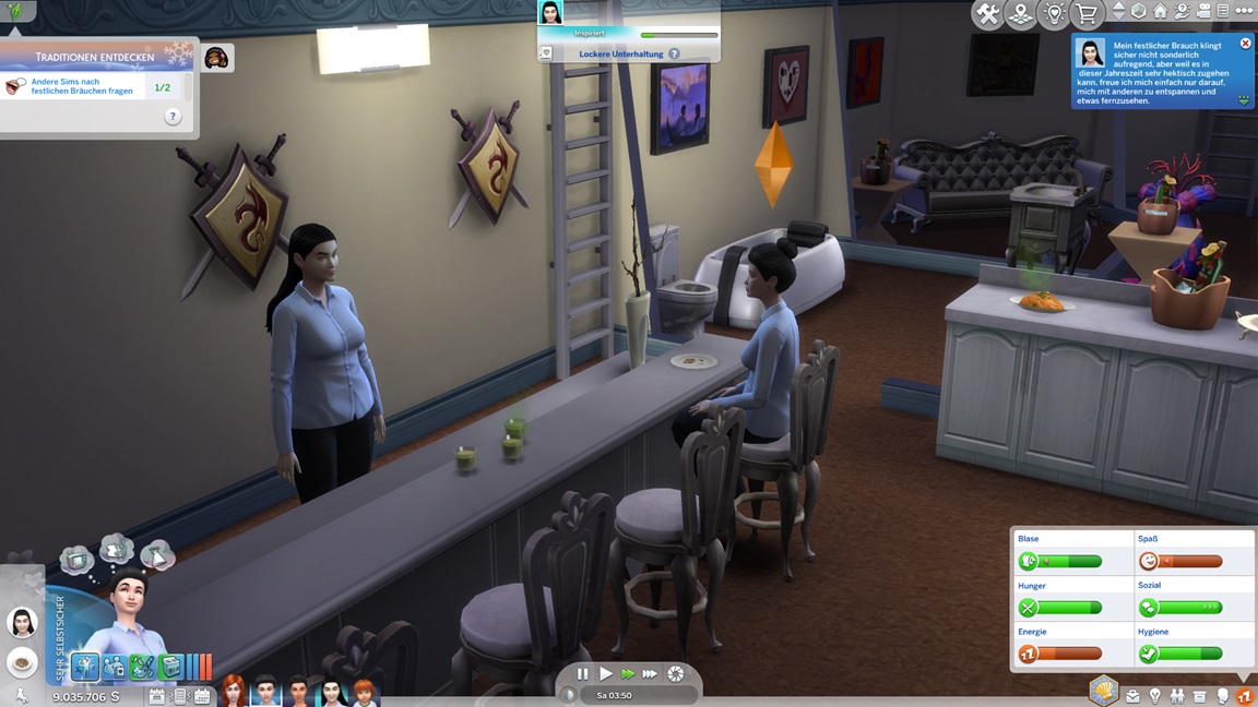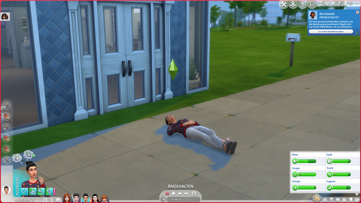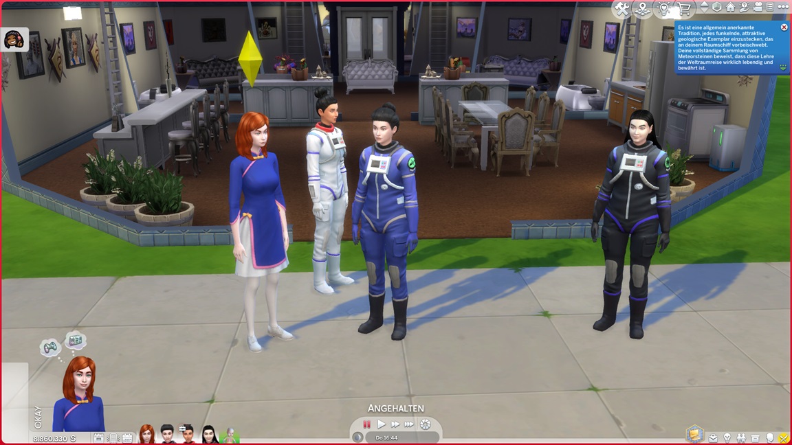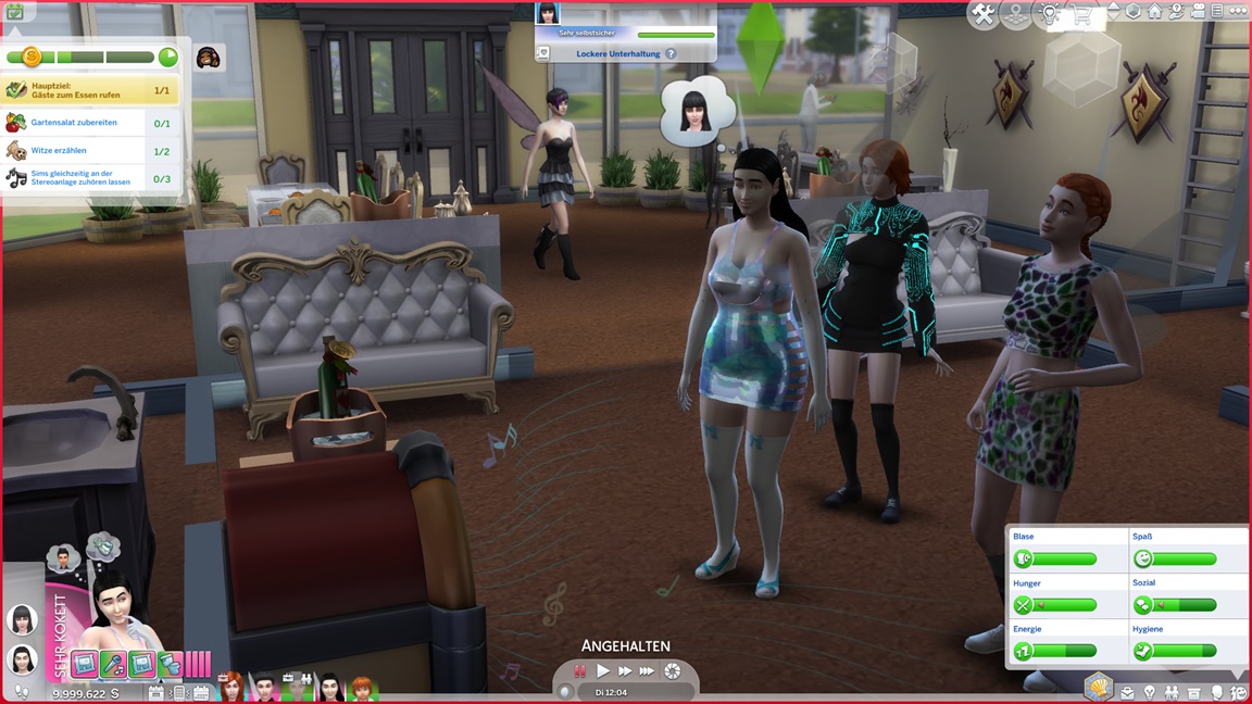 Die neue Woche bringt an. Die eine Queste verlangt (nach dem Erhalt des Newsletters) nach der Herstellung von Ambrosia, die andere nach einer Feier. Ein Bug sorgt derweil dafür, dass Sims sichtbar bleiben, die eigentlich auf Arbeit oder in der Schule weilen.