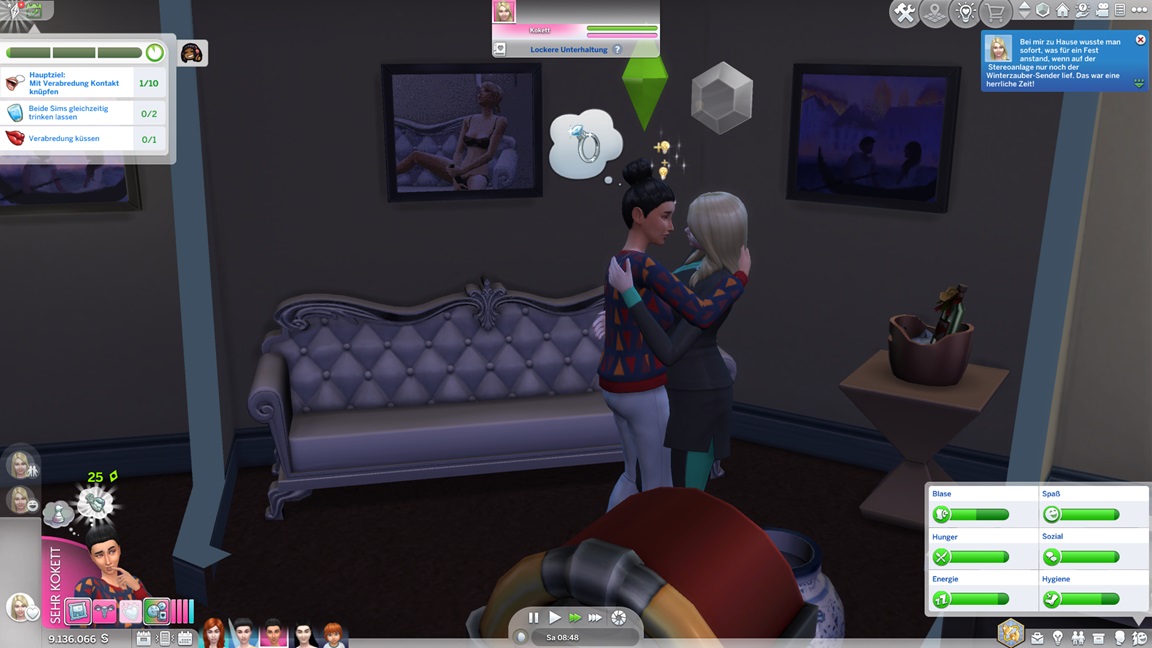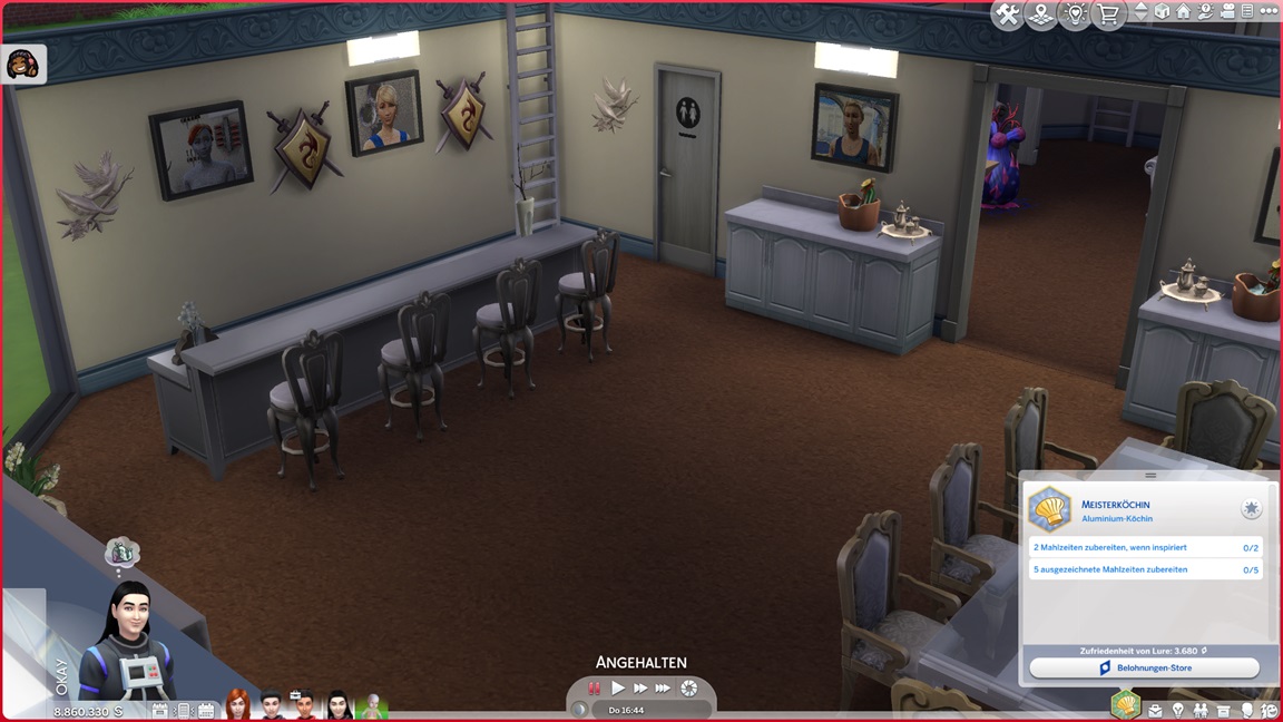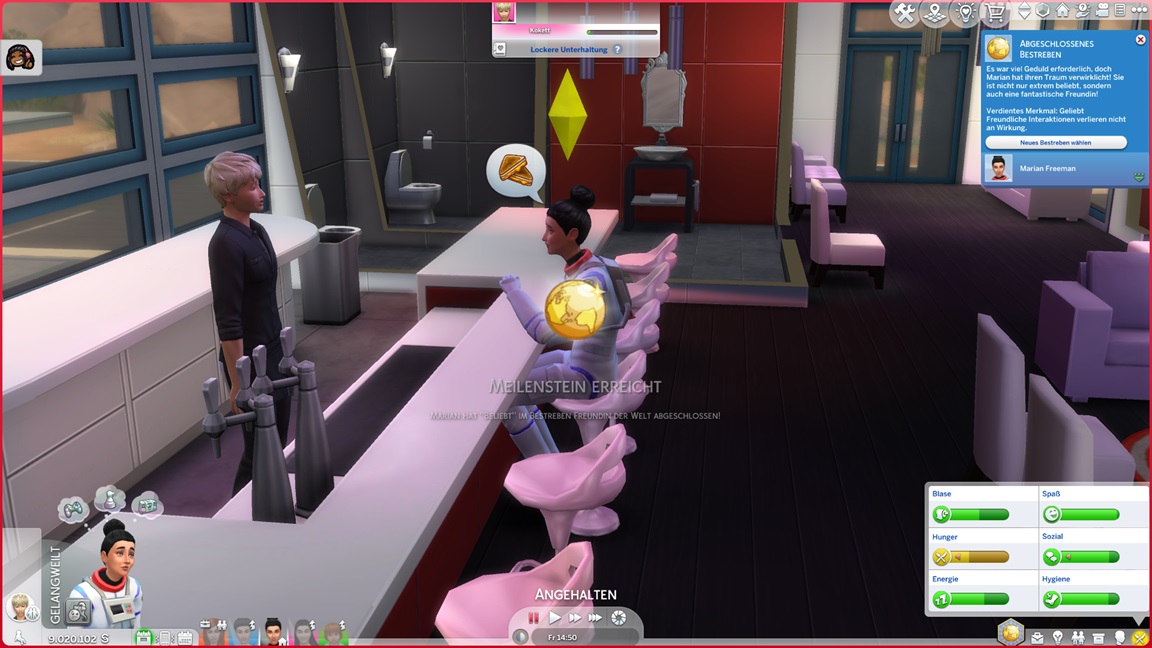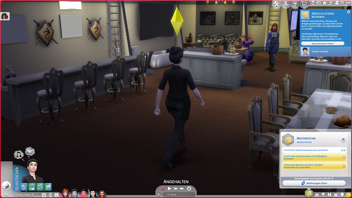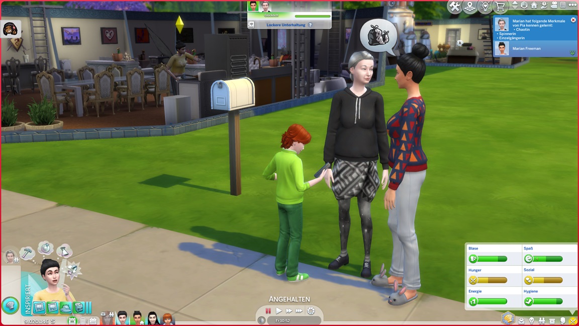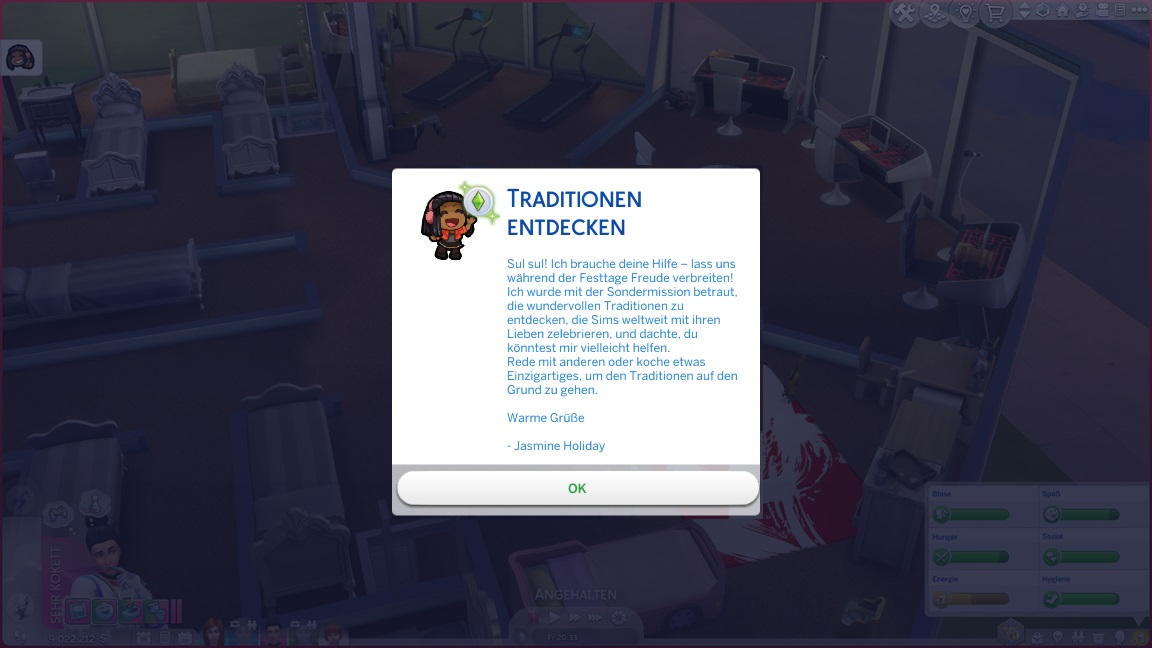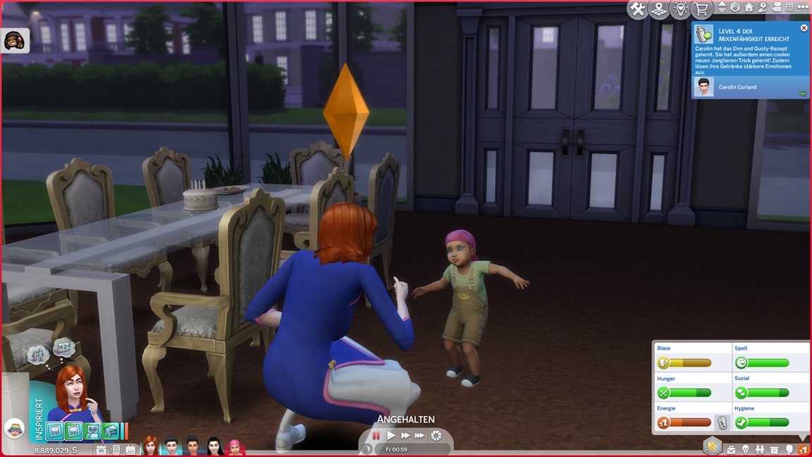 Die neue Woche bringt an. Die eine Queste verlangt (nach dem Erhalt des Newsletters) nach der Herstellung von Ambrosia, die andere nach einer Feier. Ein Bug sorgt derweil dafür, dass Sims sichtbar bleiben, die eigentlich auf Arbeit oder in der Schule weilen.