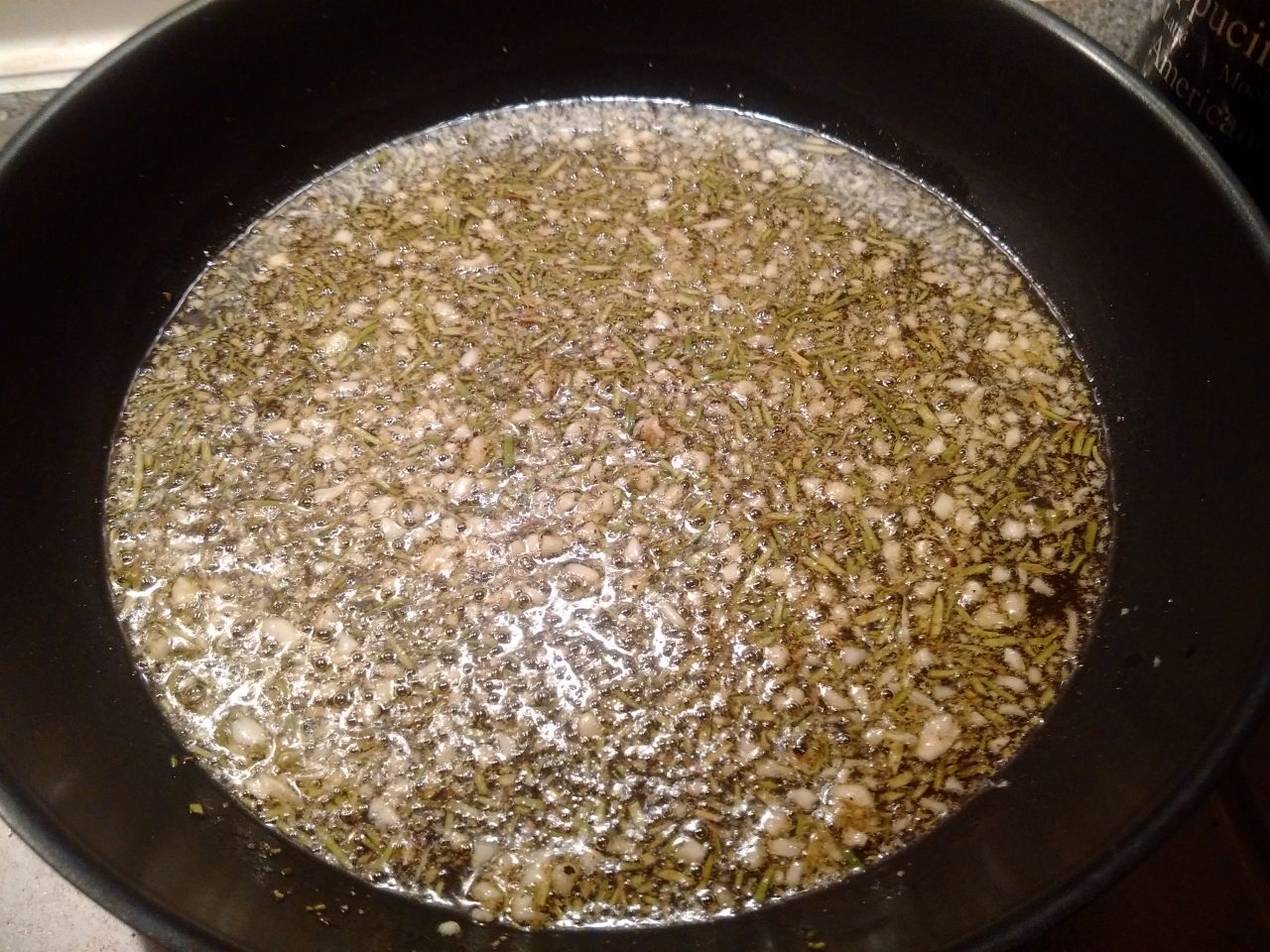 Damit die Gewürze nicht verbrennen stellt man eine Infusion her: Knoblauch, Rosmarin und etwas Pfeffer/Salz kommen mit Olivenöl in die Pfanne und werden kurz angeröstet.