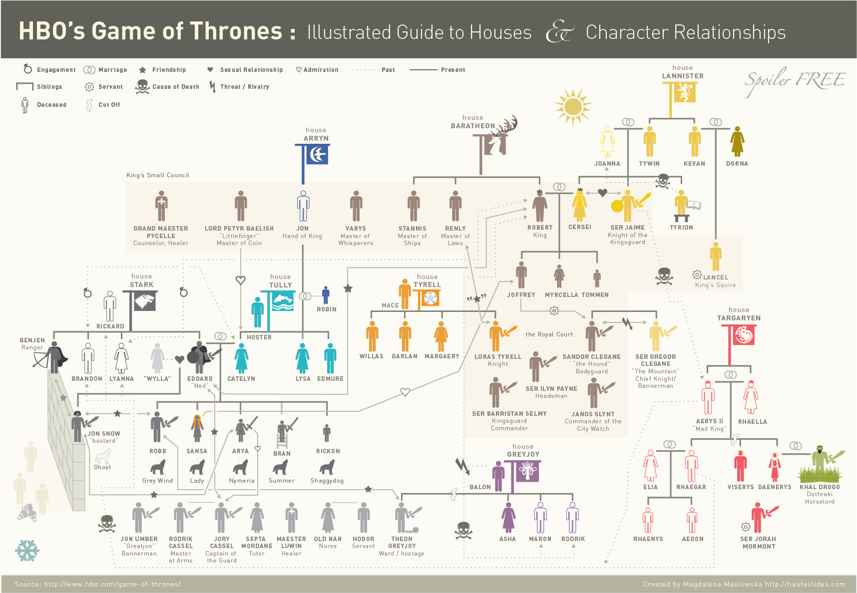 Wobei eigentlich für Leute, die die Bücher lesen, die Beziehungen recht klar sein sollten. Das einzige, was selbst für Leser verwirrend ist, ist möglicherweise der exakte Stammbaum Targaeryen, sowie der verstorbene Stammbaum von Ned.