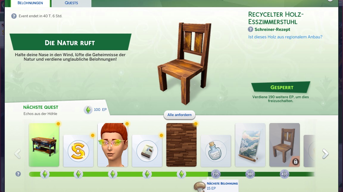 Das führt schließlich in den Shop. Die Belohnungen dieser Woche umfassen eine recyclete Werkbank, eine Sonnenbrille, eine Wandverkleidung und schließlich ein Sammelobjekt.