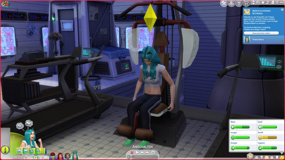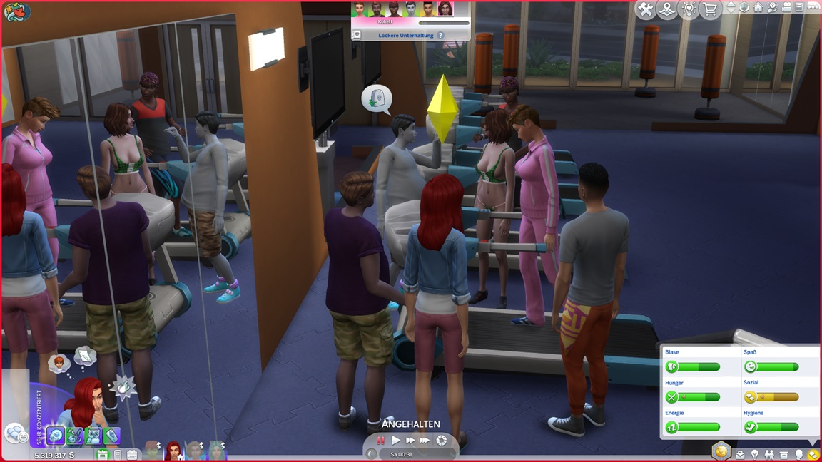Zora stellt fest, dass sie Fitness mag. Das Erwachsenentrio besucht das Fitnessstudio, während die Kinder in der Schule weilen. Das Gepumpe geht voran.