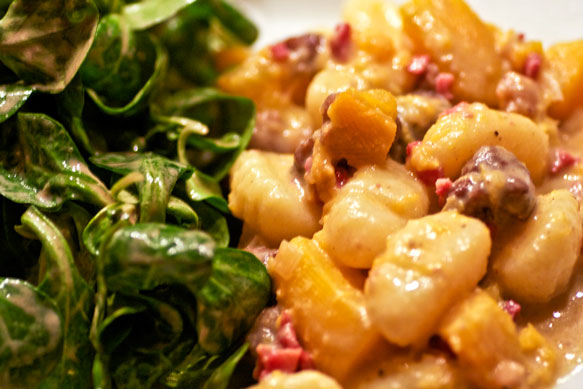 Zwei gewürfelte Schalottenzwiebelchen in Olivenöl anbraten, Kürbisstücke dazu geben und mit braten, dann mit Weisswein ablöschen. Etwas Gemüsebrühe dazu und weichkochen. Dann eine Packung geschälte Kastanien dazugeben und kurz mitkochen. Dann mit Sahne auffüllen und etwas Curry, Salz, Pfeffer zum Abschmecken benutzen. Zur Seite stellen und die Gnocci in Salzwasser garen, dann abgiessen und die Sauce untermischen.