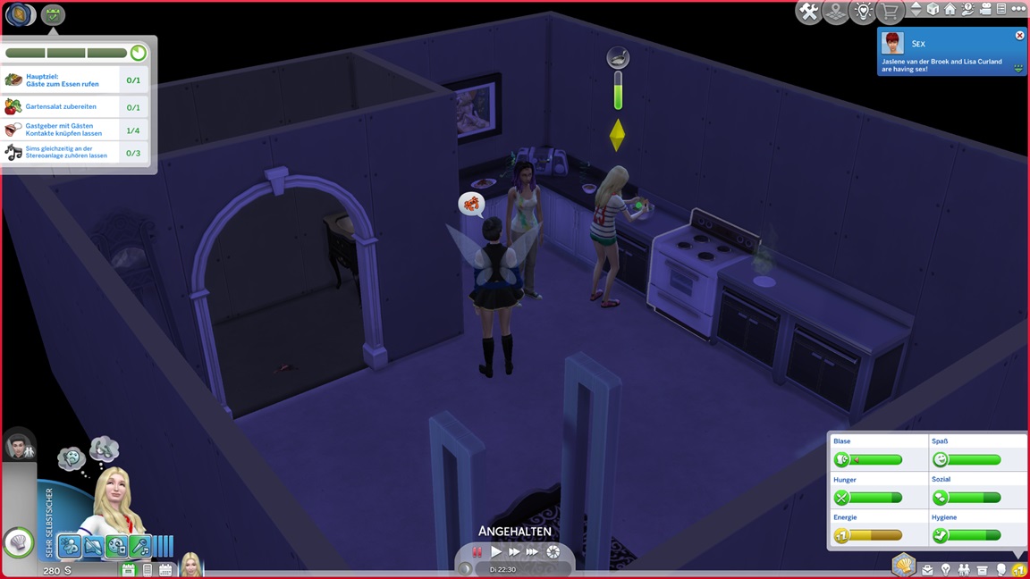 Das war dann doch noch einmal fast eine komplette Partie. Haushalte mit einem Sim spielen sich wirklich anders - ich verbrachte viel Zeit auf höchster Beschleunigungsstufe, und spätestens dann zeigt das Spiel, wie sehr es doch aus Warterei auf einen Statusbalken besteht. Für Anissa nutzte ich zum ersten Mal die verringerten Bedürfnisse, und das verwandelte sie in ein Monster.