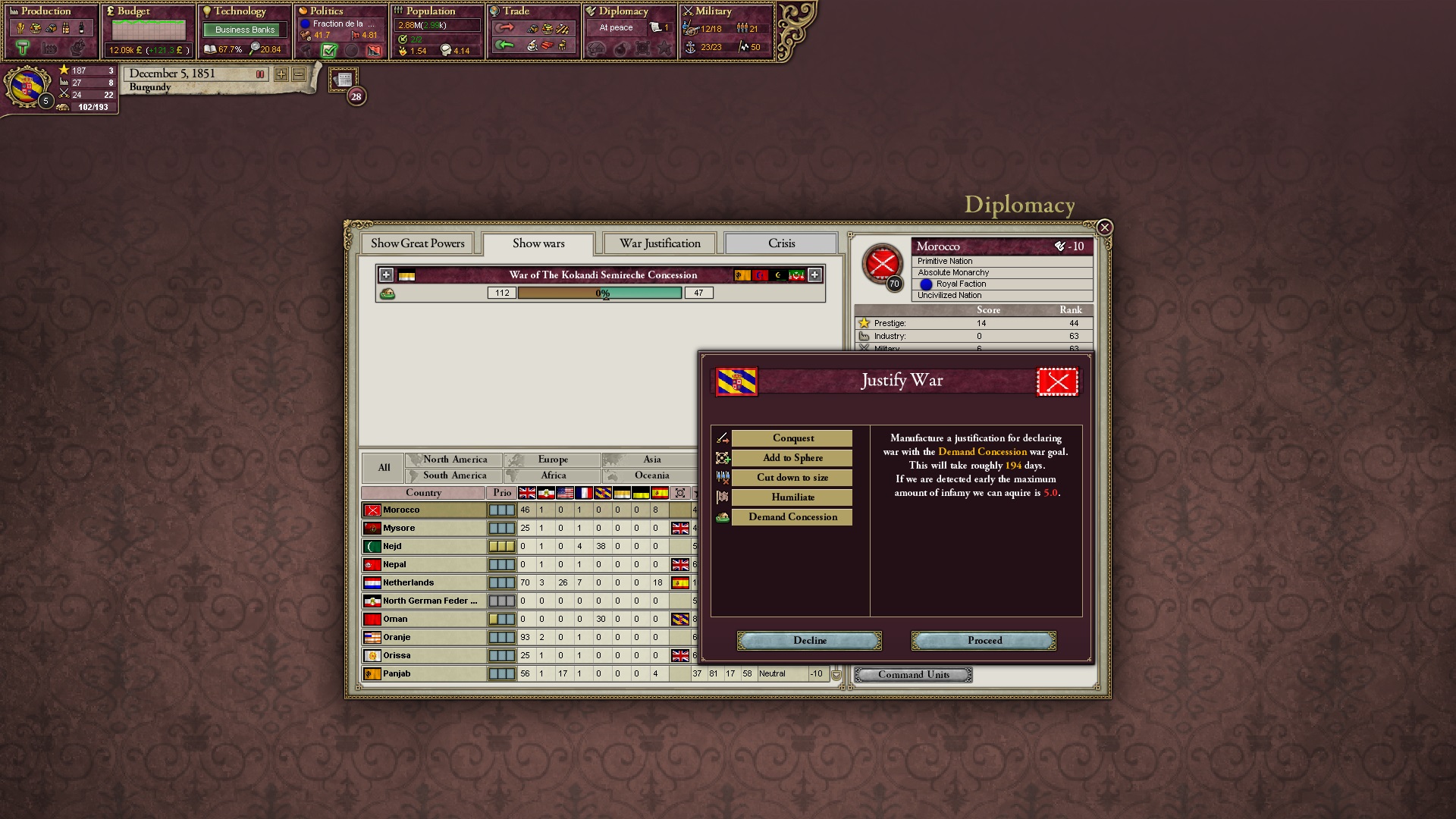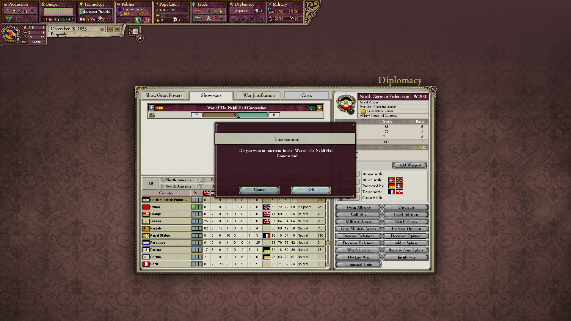 Mein Plan steht fest, tritt aber auf der Stelle: Ich bräuchte Deutschlands Hilfe, um Belgien einzunehmen. Anschließend kann ich die Entscheidung abschließen, die mir neue Kriegsgründe gegen Frankreich beschert, und dies führt zu einem Krieg gegen Ägypten, in den Frankreich einsteigt.