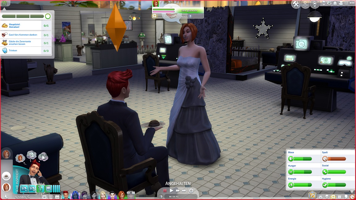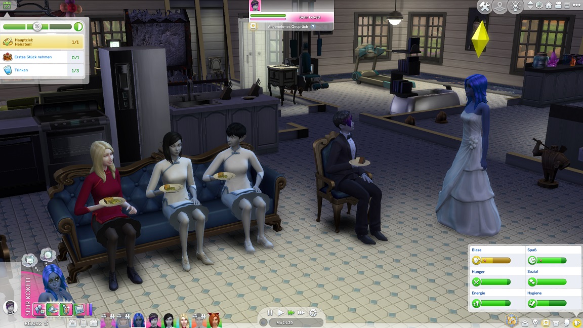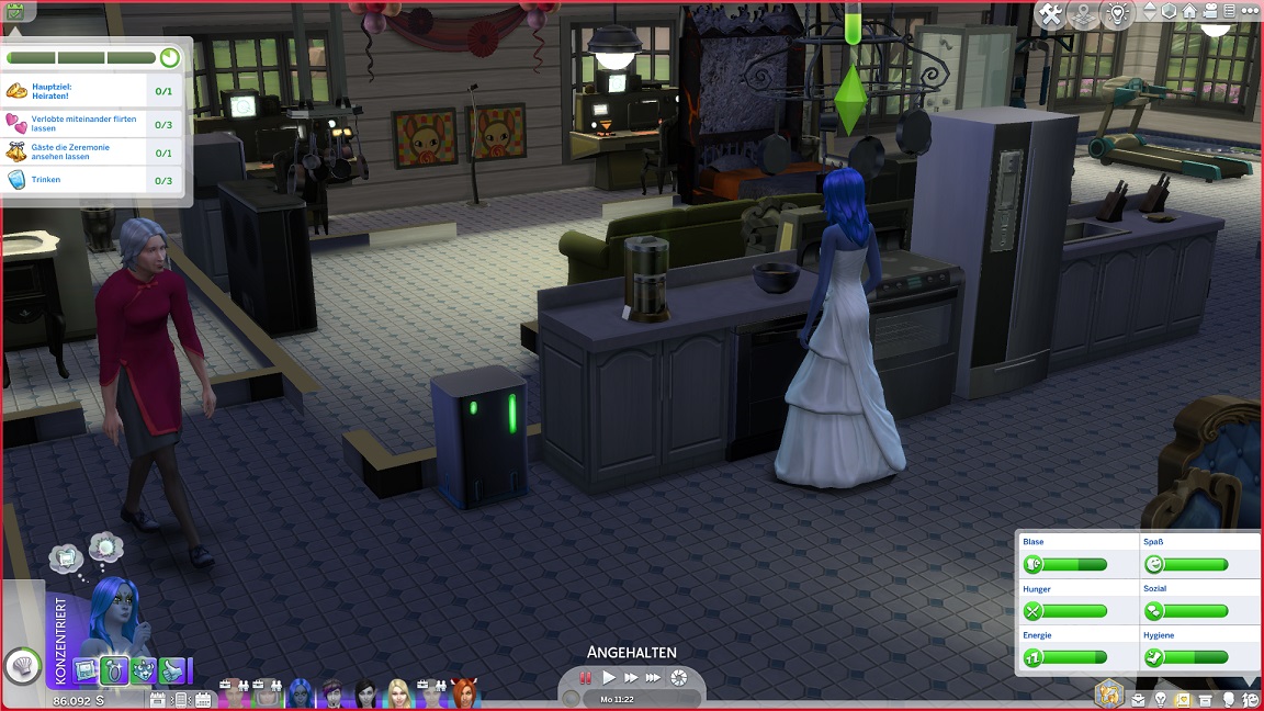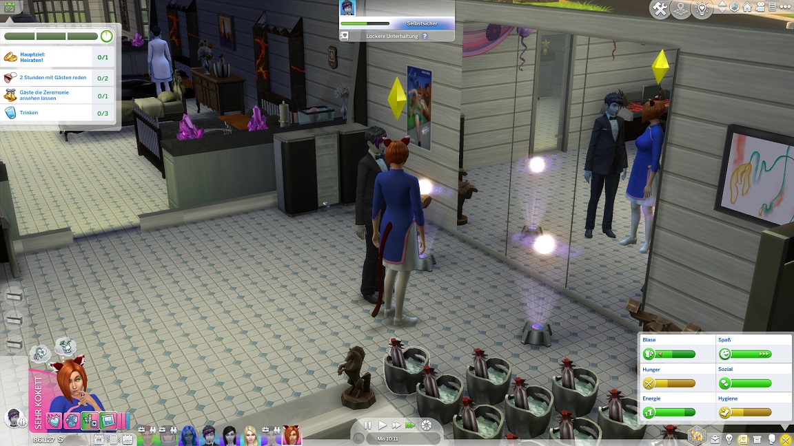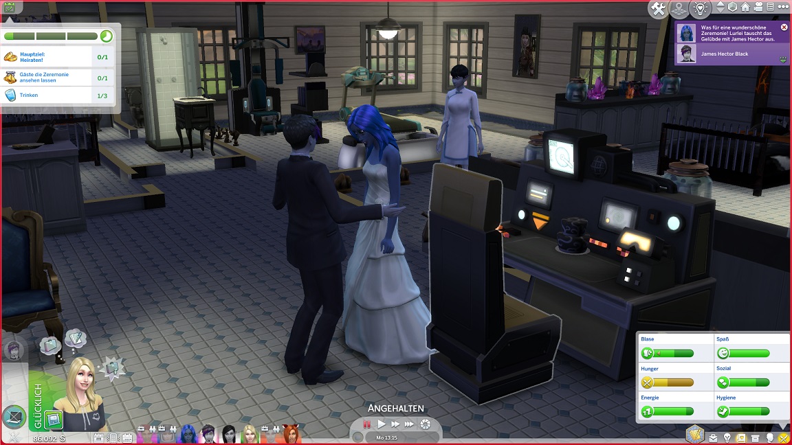 ... weswegen schließlich der Bräutigam aus dem Bett geholt wird. Neben ihm wirft sich auch seine Mutter in Schale - Lurlei backt, und der Rest der Mannschaft geht entweder arbeiten oder klebt weiter in Räuberzivil an ihren Projekten.