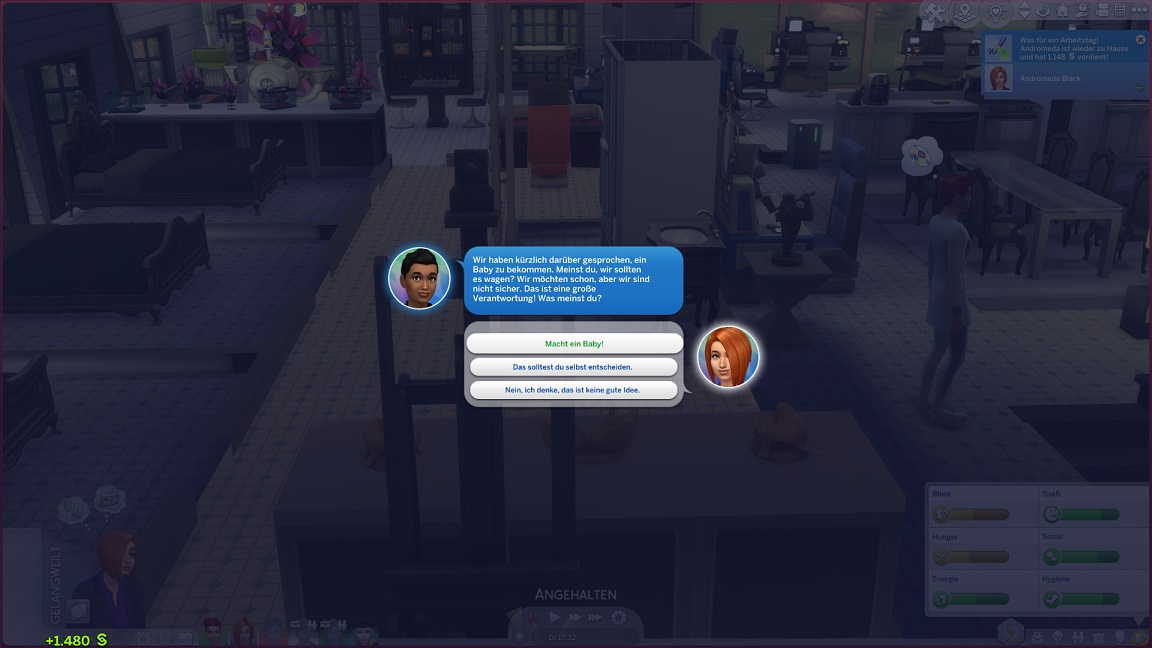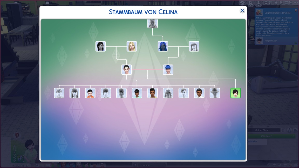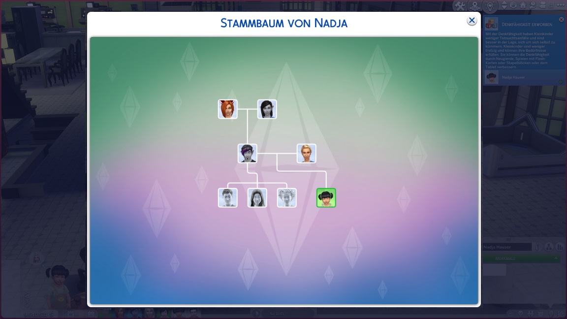 Säuglinge verlassen diese Phase mit einem einfachen Klick auf den Kinderwagen - und Andromeda setzt sie alle in die Liste. Sie beginnt mit Nadja, der Tochter Lexis und James', die sich nach Zufallsgeneratorwahl als "wild" herausstellt.