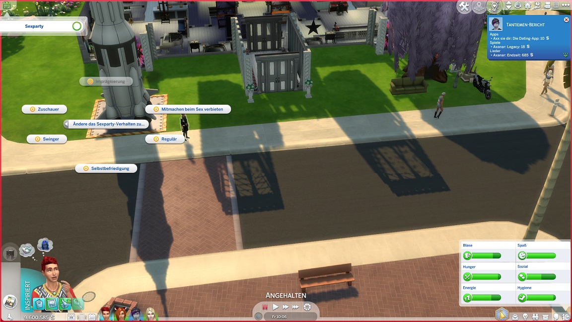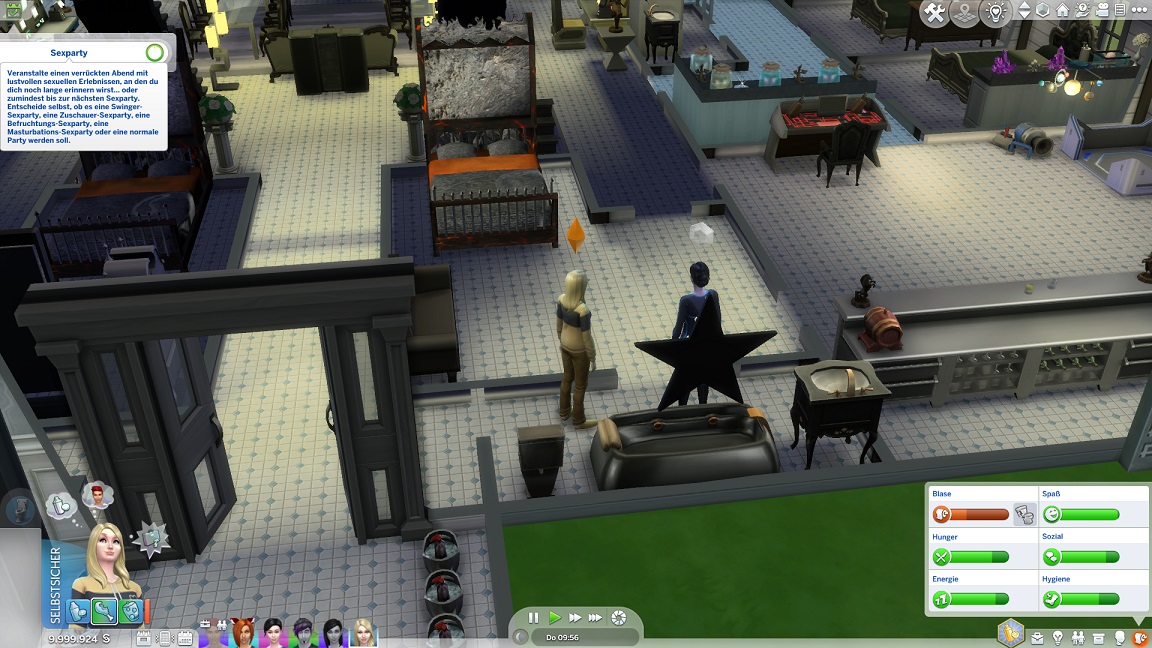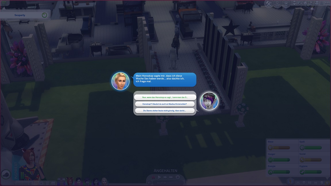 Um zu verhindern, dass NSCs unter den Geschlechtskrankheiten endlos leiden, während die Spielercharaktere allesamt Immunität erwarben, deaktiviere ich dieses Feature. Ich möchte noch einen Test unternehmen, auch um zu sehen, ob es vielleicht an der Aktualisierung hakte. Dabei stört allerdings noch der Umstand, dass Lisa weder Carolin noch Laura kennt, und obwohl ihr die Arbeit spürbar zusetzte, organisierte Jack eine "Party", um genau dies zu ändern.