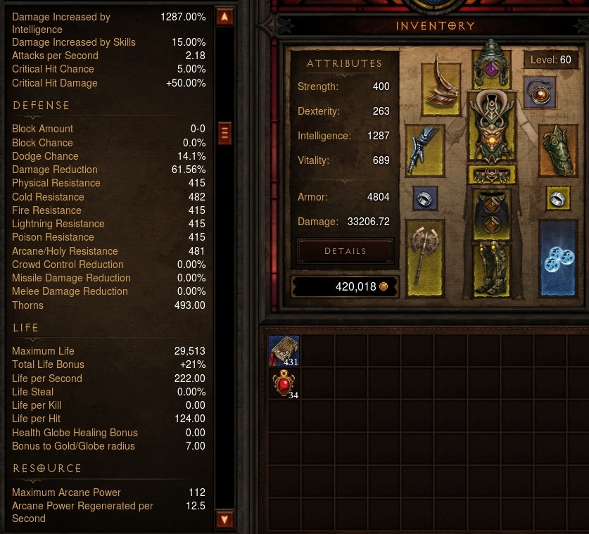 Mit diesem Build bin ich Solo in Inferno unterwegs, aktuell Mitte Akt 2. Die erste Hälfte von Akt2 ist damit gut farmbar, für die zweite Hälfte sind mir die Items noch zu schwach.