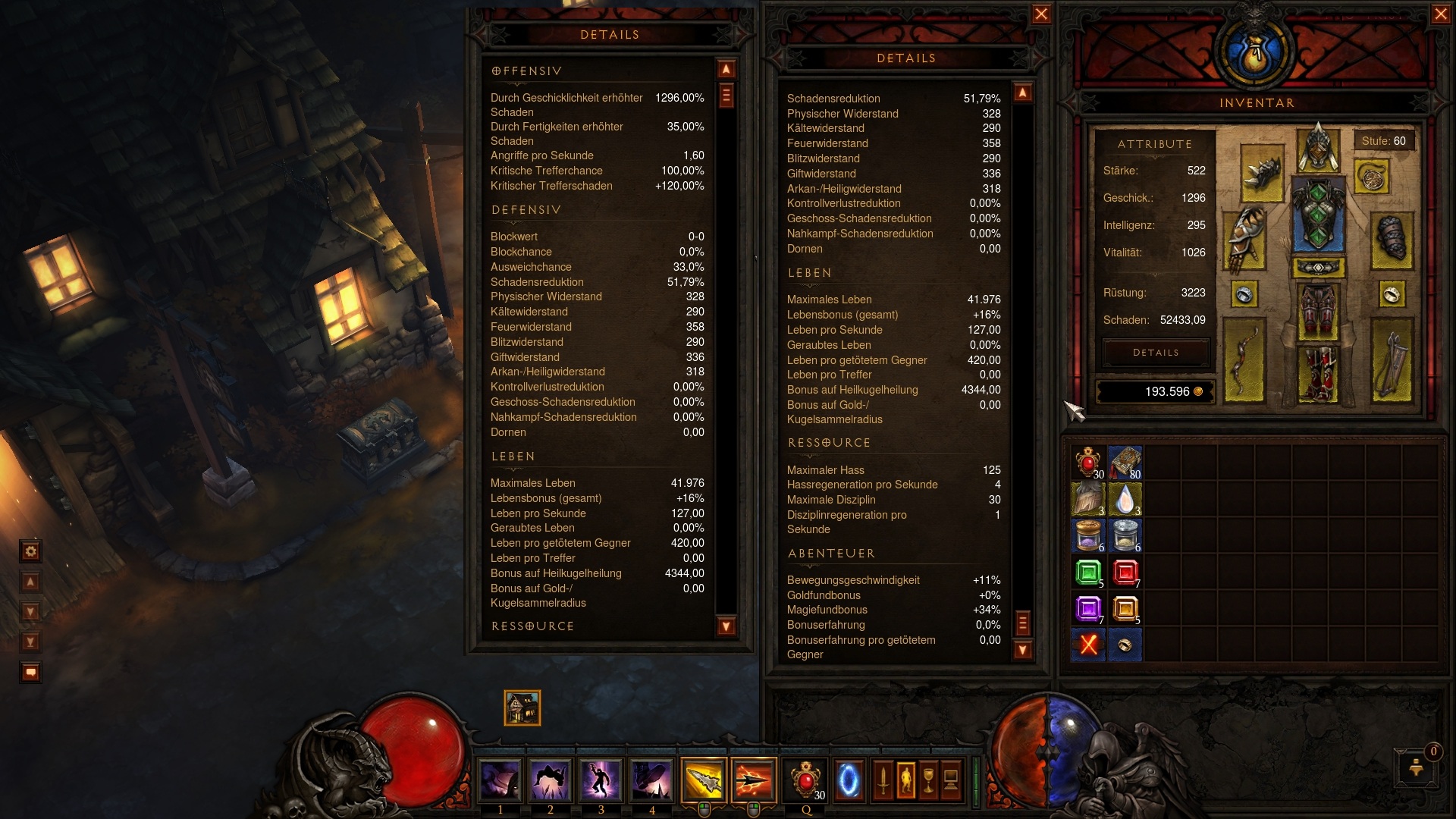 Bei Geschicklichkeit und damit Schaden ist noch Luft nach oben. Leider sind gute Sachen mit Geschicklichkeit sauteuer, gibt einfach zu viele DHs und Mönche brauchen es ja auch. Ansonsten achte ich auf kritischen Trefferschaden, da muss auch noch mehr her. Hier gilt aber das selbe, seit ias abgeschwächt wurde will alle Welt kritischen Schaden. Resistenzen und Rüstung bieten je ca 45-55% Schadensreduktion. Viele DH haben hier deutlich niedrigere Werte, da ich aber öfter allein unterwegs bin muss ich stabil genug sein wenigstens nicht onehitted zu werden. Leben habe ich sehr viel, das war nichtmal Absicht. Auf vielen Sachen war Vitalität mit drauf. Hier tausche ich mittelfristig Vitalität gegen Geschicklichkeit. Durch die hohe Geschicklichkeit kommt man auch auf eine ganz nette Ausweichchance.