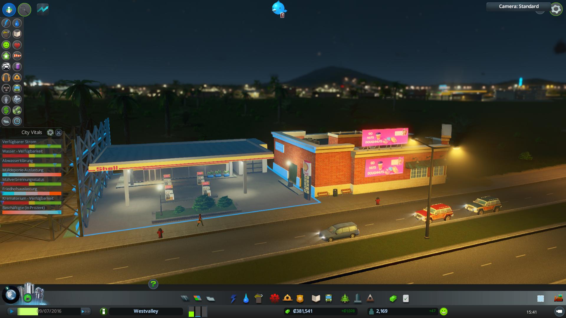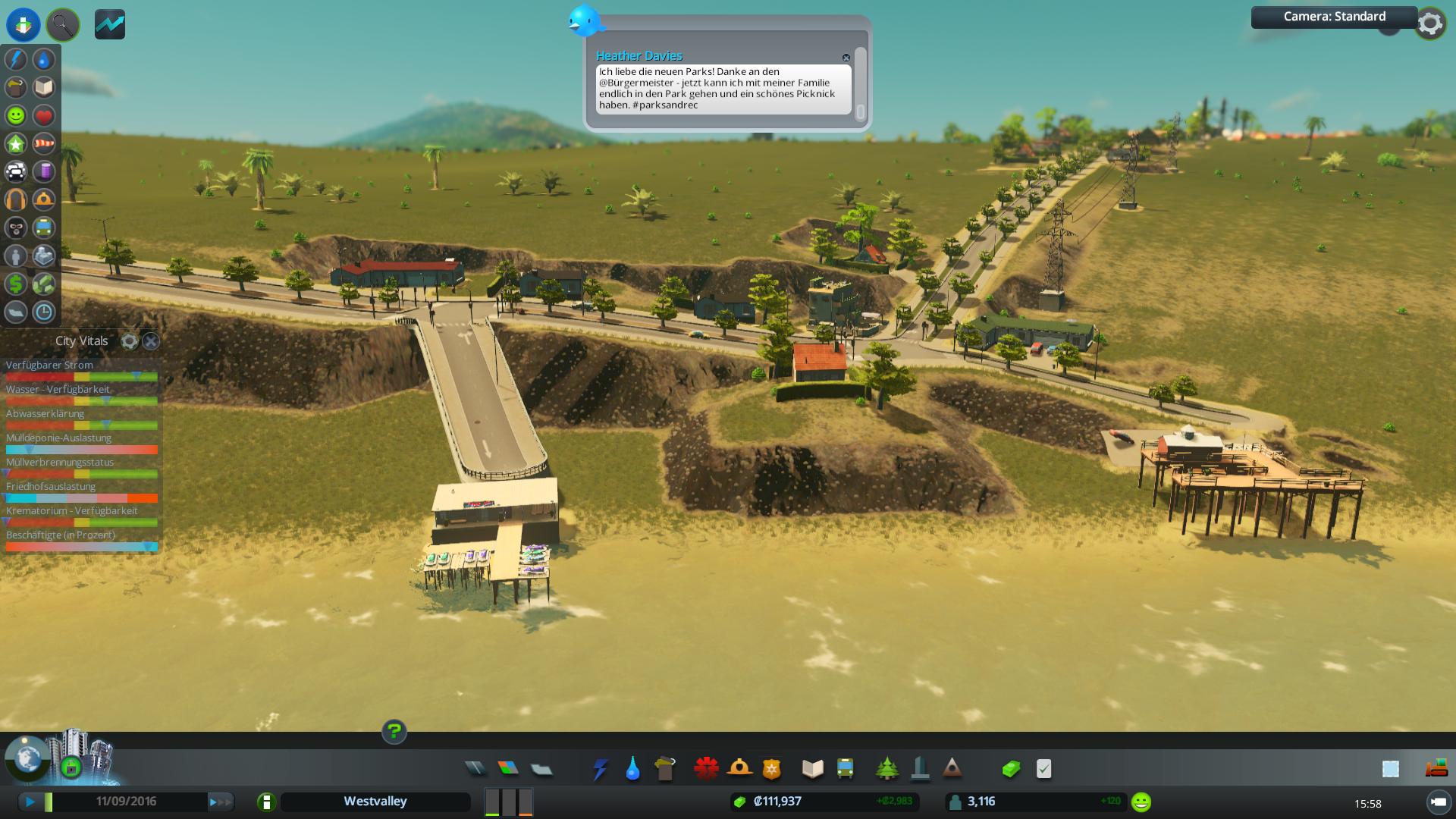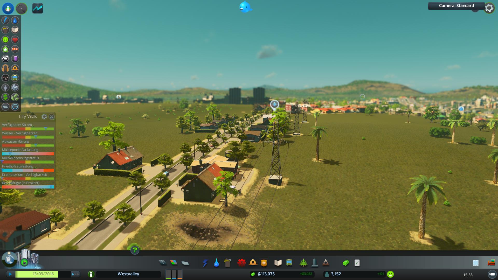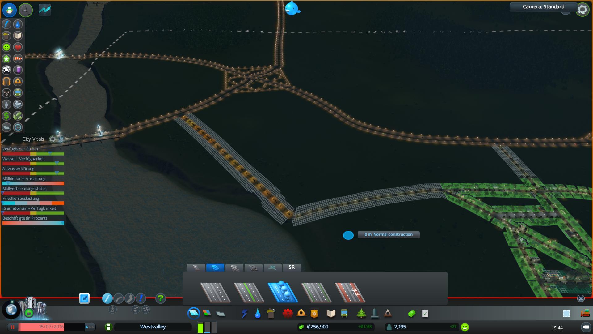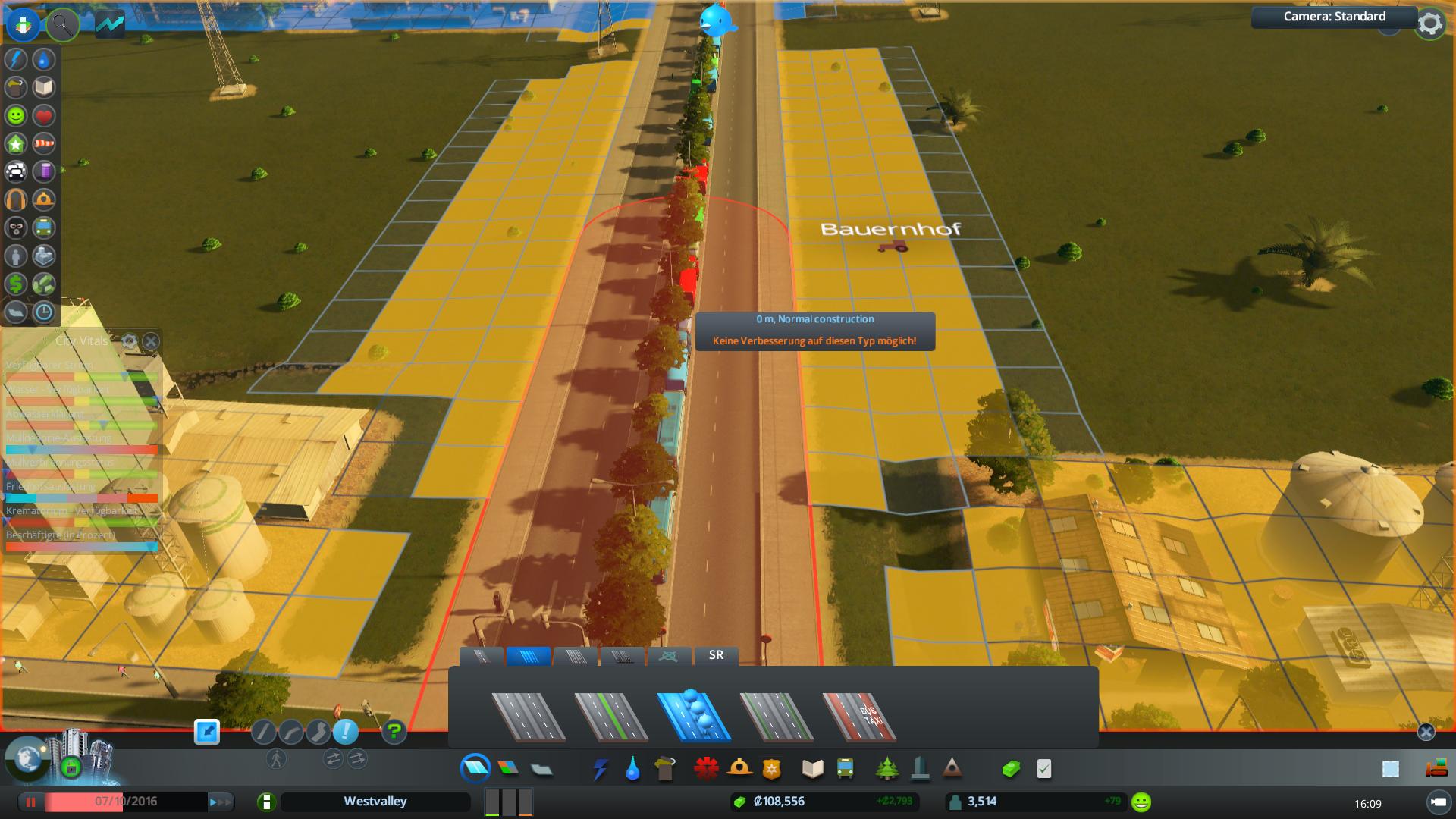 Durch die Erweiterung der Welt, kann ich jetzt meine Stadt links erweitern. Schöne Straße Richtung Fluss hingepflanzt und leichtes Wohngebiet ausgegeben. Hier sollten dann nette kleine Villen entstehen. Unter Umständen muss ich hier noch mit Verordnungen eingreifen um arme Bewohner fern zu halten, aber dazu später mal mehr.