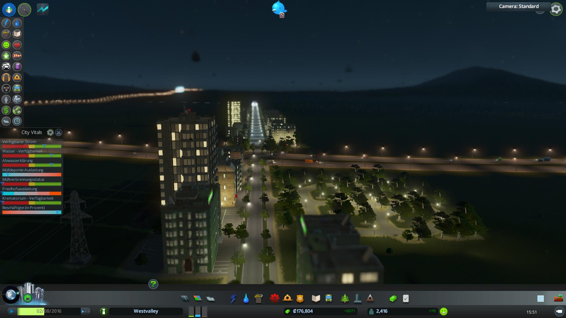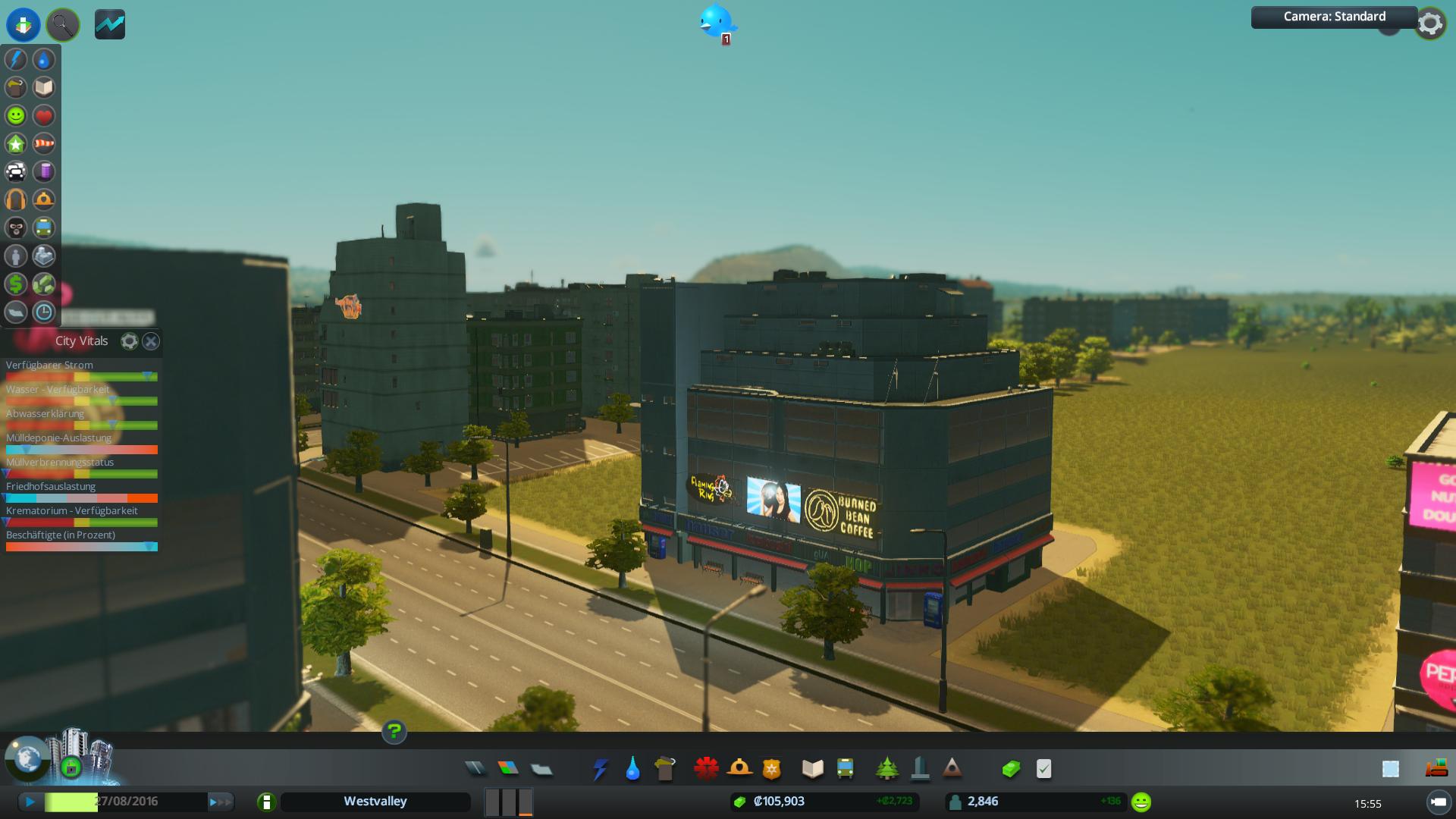 Zweite Erweiterung und gerade das Gegenteil. Wir bauen hier unsere Stadt nach Norden weiter und setzen hier an der großen Straße nur "große" Wohngebiete, d. h. Hochhäuser. Dies dauert zwar ne Weile, am Anfang sind es eher größere Apartments, aber hier ensteht das eigentliche Stadtzentrum.